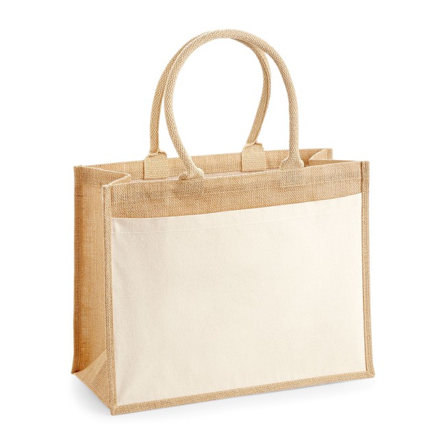 100% juta laminata. Shopper multiuso in Juta laminata con tasca frontale in tela 100% cotone. Etichetta removibile. Dimensioni: 42 x 33 x 19 cm, lunghezza manici: 55 cm, capacita': 21 litri, area stampabile: 36 x 22 cm.