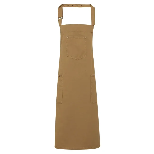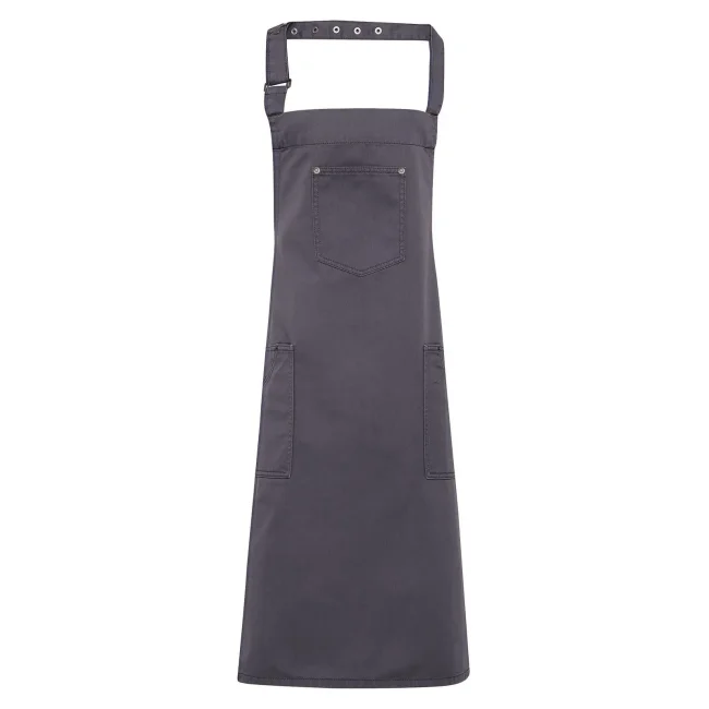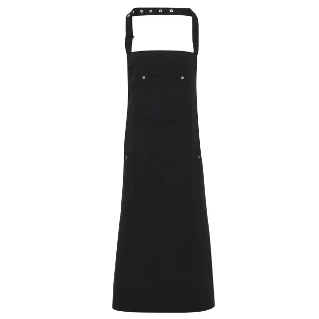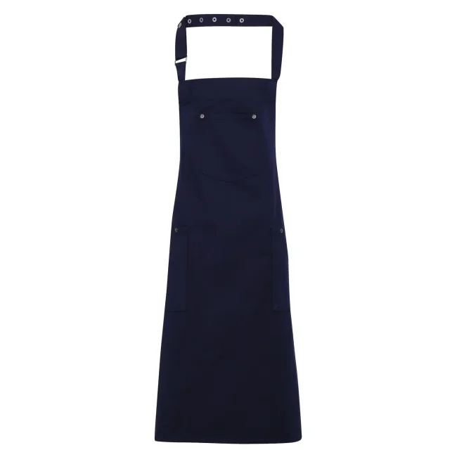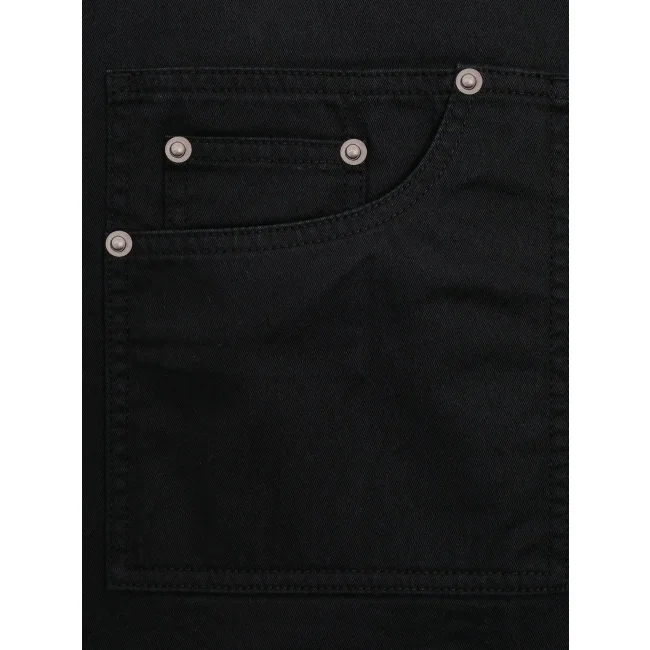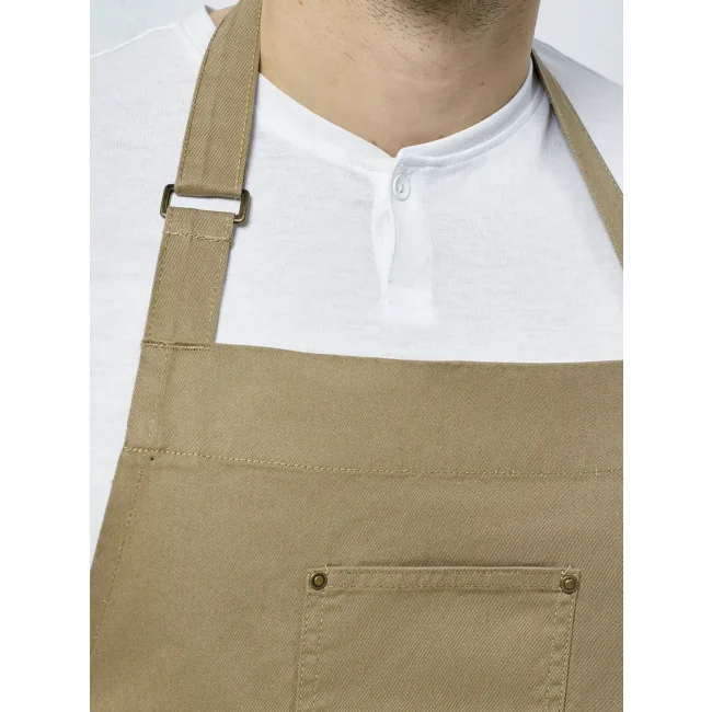 100% cotone. Grembiule con pettorina e grande tasca frontale con rivetti e cuciture, due tasche laterali, cordoncino al collo regolabile e fermabile con bottone a pressione. Lavabile a 60 °C.