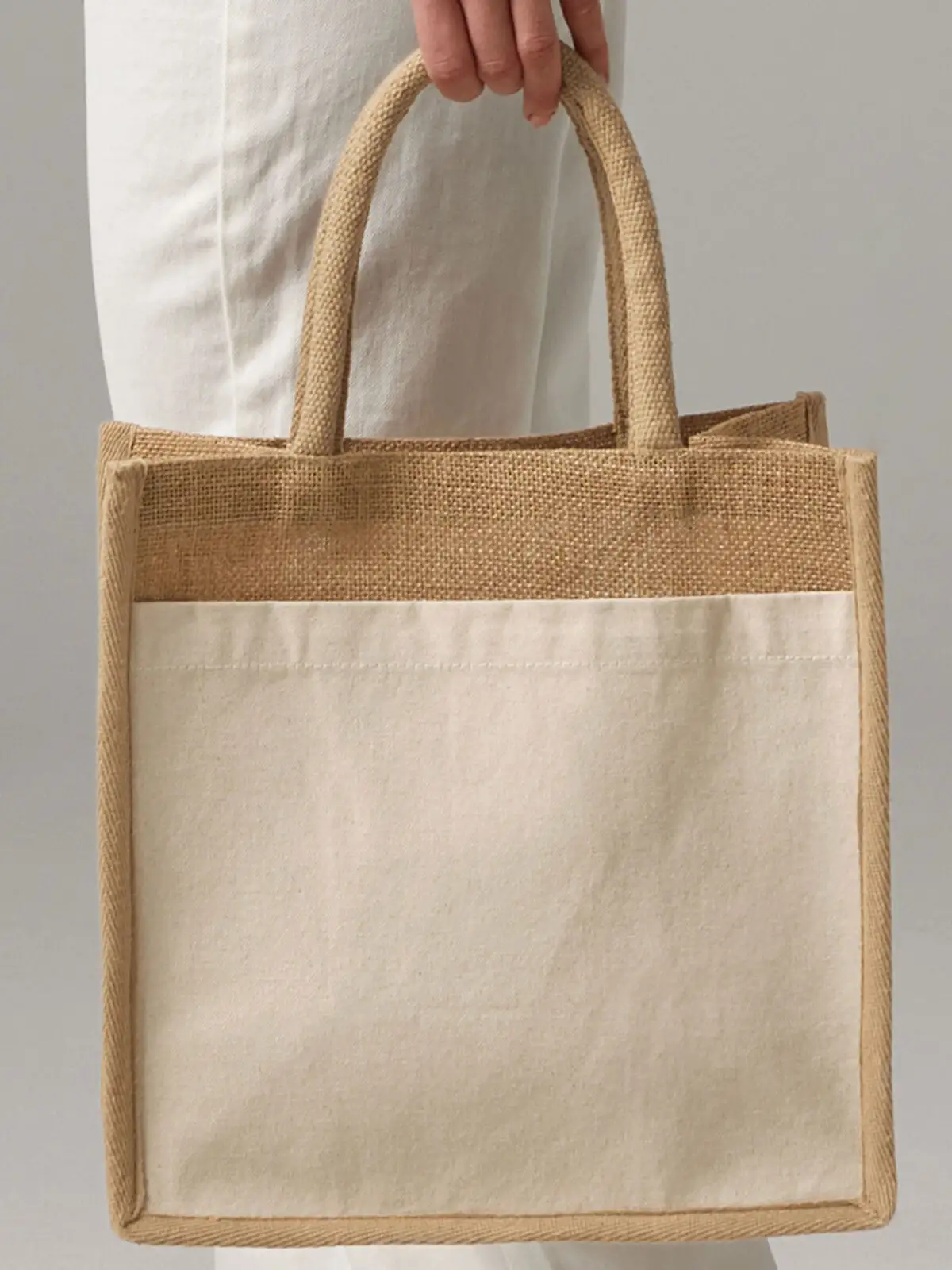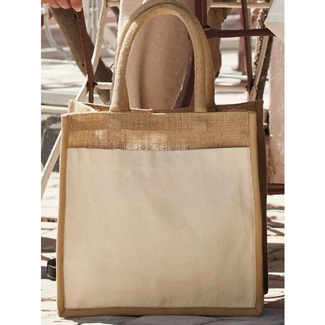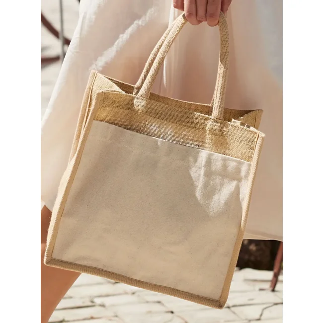 100% Juta . Shopper con manici in cotone Canvas e tasca frontale stampabile.