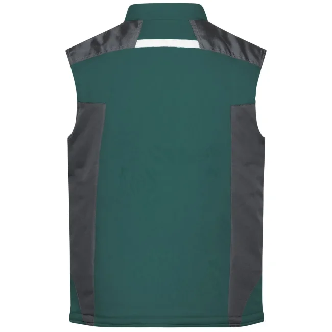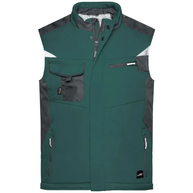100% poliestere. Gilet in softshell con caldo rivestimento interno in pile, tessuto robusto, antivento, traspirante e impermeabile. Colletto rigido, rinforzo alle spalle con cordura, tasche multi-funzionali, dettagli catarifrangenti sia davanti che sul retro.
