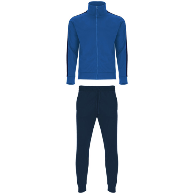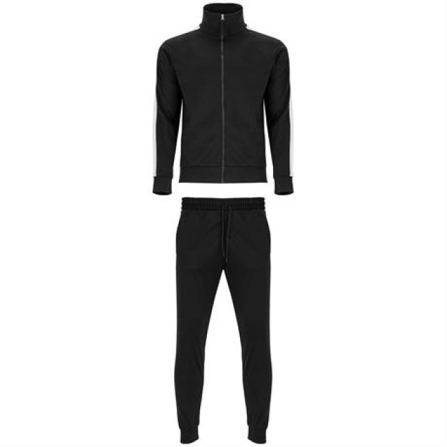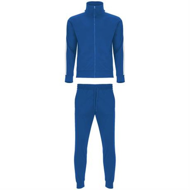 Tuta composta da giacca e pantalone:1. Collo alto con copri cuciture interne in tinta.2. Collo, polsini e girovita in costina 1x1.3. Cerniera centrale in tinta con tiretto.4. Tasche laterali della giacca con cerniera.5. Fascia laterale in contrasto.6. Pantalone con girovita elastico e cordoni regolabili.7. Due tasche laterali.8. Tasca posteriore con cerniera.9. Pantaloni con caviglie elasticizzate in costina 1x1.