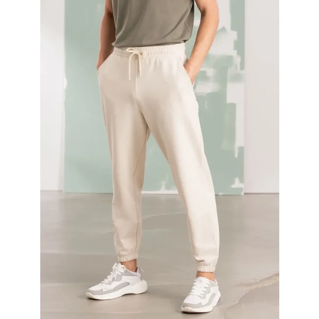60% cotone rigenerato 40% poliestere riciclato. Pantaloni in felpa unisex dalla vestibilità ampia, felpati internamente. Vita e polsini elasticizzati, cordino tondo in vita, due tasche laterali, una tasca sul retro, cuciture in tinta. Etichetta senza brand. Busta riutilizzabile 100% plastica riciclata.