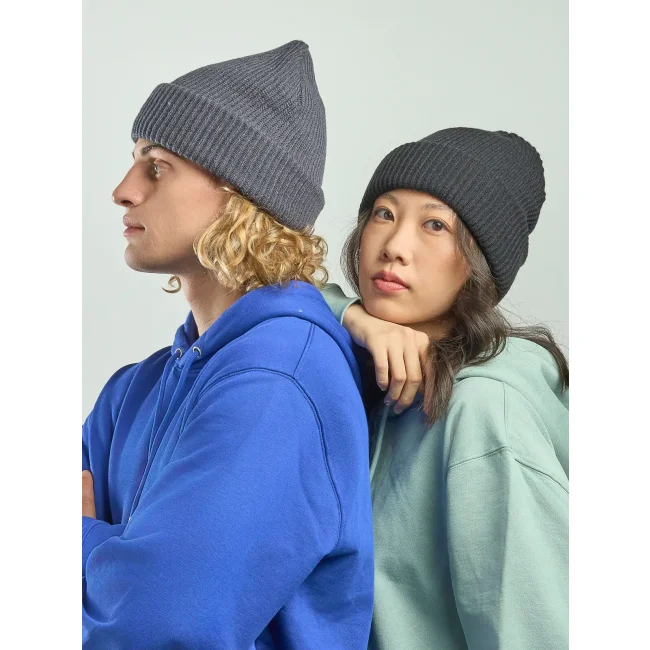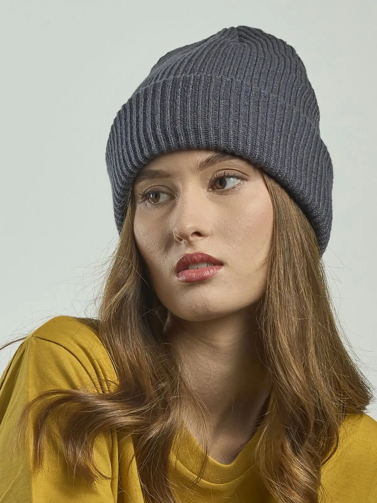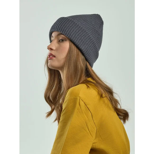 Cuffia a coste realizzata in poliestere riciclato, dotata di risvolto e fodera in Polartec. Presenta un'etichetta removibile, rendendola versatile e adatta a diverse occasioni.