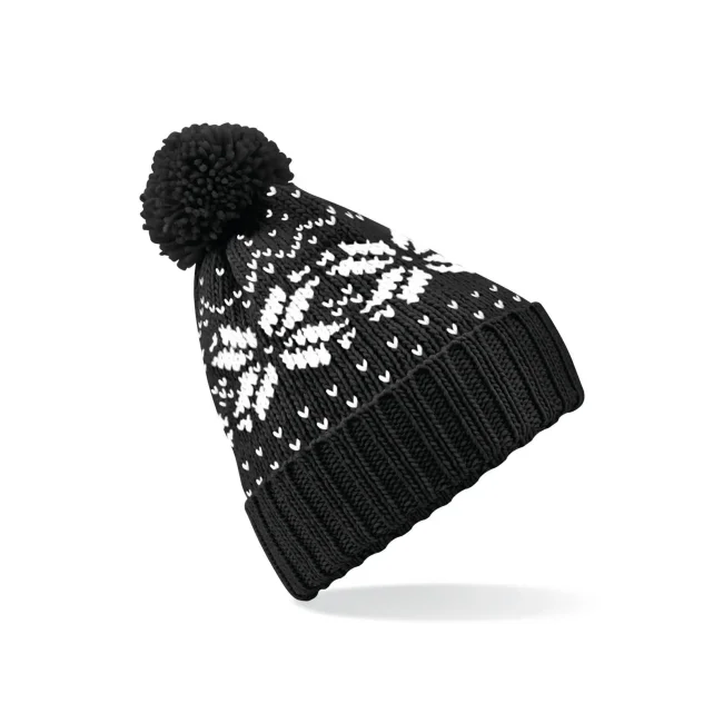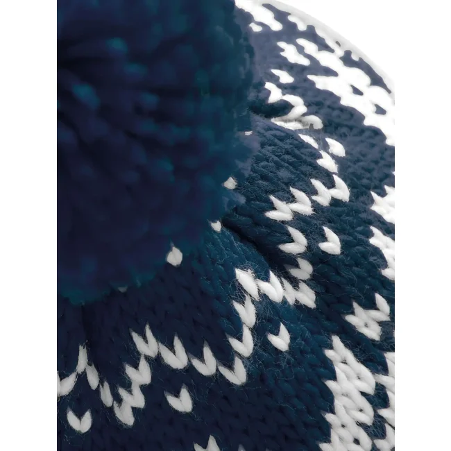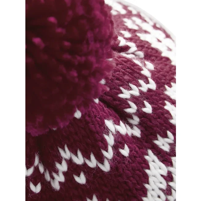 Cuffia Fair Isle Snowstar® realizzata in 100% acrilico soft-spun, con un design intrecciato che simula un effetto lavorato a mano. Il pon-pon colorato e il modello con risvolto offrono comfort e stile, mentre l'etichetta removibile facilita il rebranding.