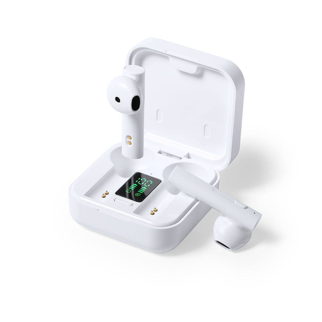 Cuffie in-ear con elegante finitura bianca e connessione Bluetooth 5.0. Dotate di pannello di ricarica solare e display LCD per monitorare lo stato di carica. Include custodia di alta qualità e manuale in inglese e spagnolo.