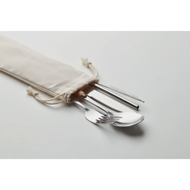 Set di posate riutilizzabili in acciaio inossidabile con manici in legno di faggio. Poiché l'articolo è fornito in una piccola borsa di tela, potete portarlo facilmente con voi per gustare un pranzo sano in viaggio, a un picnic o al lavoro. Questo set comprende un coltello, una forchetta, un cucchiaio e una cannuccia in acciaio inossidabile con spazzola, in modo da poter pulire la cannuccia dopo averla usata. Il tutto è racchiuso in un sacchetto di tela con cordino di chiusura. Il legno di faggio è un prodotto naturale, ci possono essere leggere variazioni di colore e dimensioni per ogni articolo, che possono influenzare il risultato finale della personalizzazione.