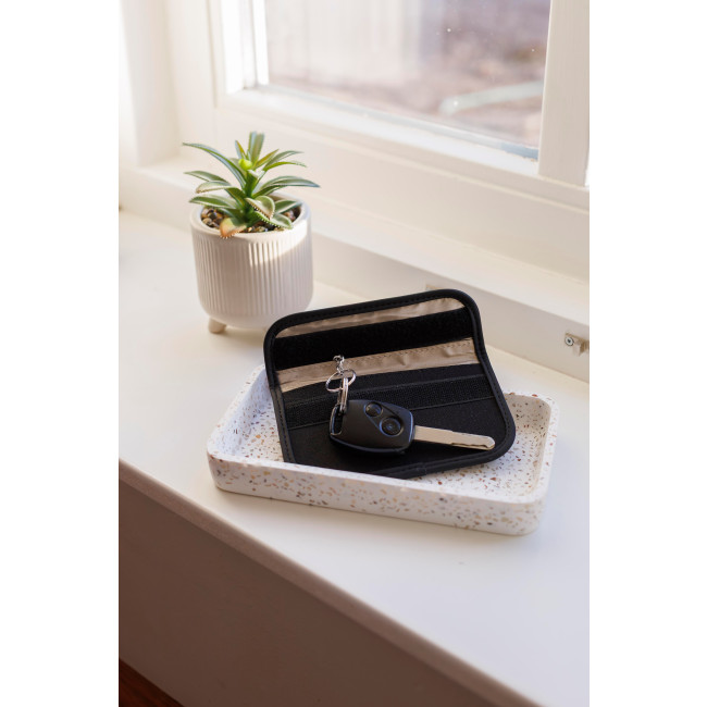 Custodia in poliestere 600D con chiusura in velcro, progettata per chiavi e carte. Realizzata in PET riciclato (rPET) e PU flessibile per garantire resistenza, ammortizzazione e durata. Dotata di protezione RFID integrata, portachiavi interno per riporre gli oggetti in modo sicuro e patta in velcro. Una scelta quotidiana più sostenibile.