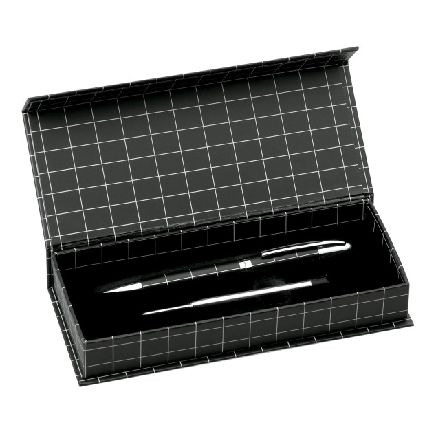 Elegante penna con meccanismo a rotazione, dal design sobrio e bicolore. Fusto in metallo con finitura liscia e rifiniture color argento. Presentata in un elegante astuccio nero con chiusura a calamita. Cartuccia Jumbo, ricarica inclusa, refill blu.