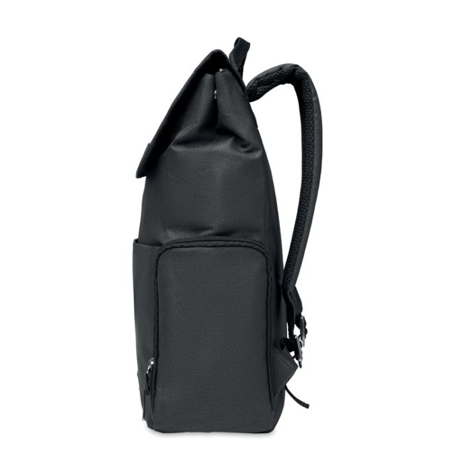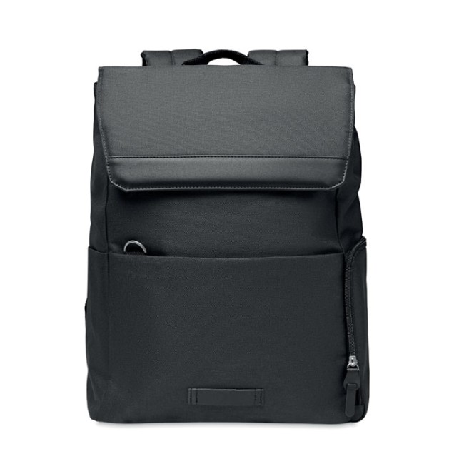 Zaino per laptop da 15 pollici in RPET 600D a 2 toni con chiusura a bottone magnetico. Portate il vostro laptop o tablet in ufficio o ovunque vi serva, in questo zaino dall'aspetto elegante. Lo scomparto del laptop è imbottito per una maggiore protezione e sicurezza durante il trasporto. Ha tasche frontali con cerniera e due tasche laterali per riporre oggetti più piccoli come notebook o bottiglie per bere. La borsa è realizzata in plastica PET riciclata.