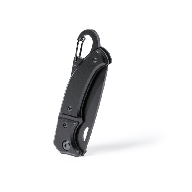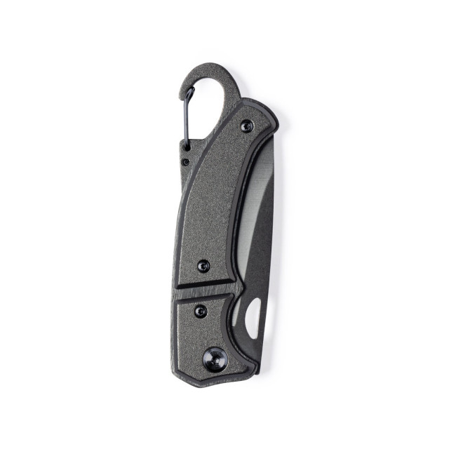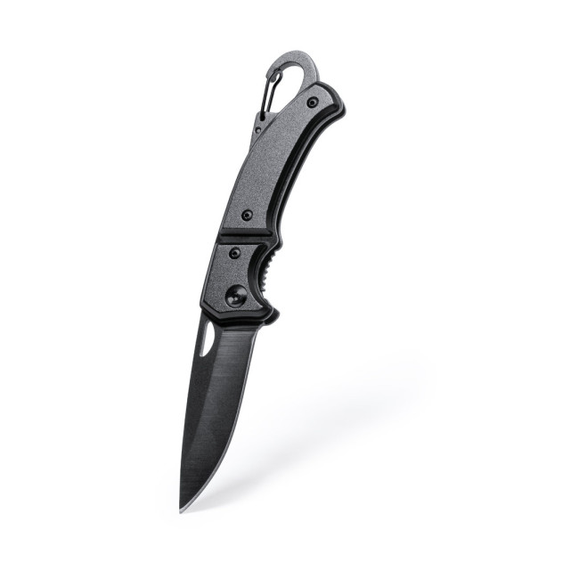 Coltello con lama in acciaio inox con finitura nera e manico in alluminio robusto abbinato. Con moschettone integrato nell'impugnatura e chiusura di sicurezza. Con lama fustellata per una facile apertura e confezionato in una scatola di design nera.