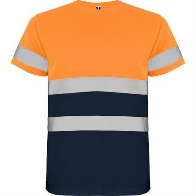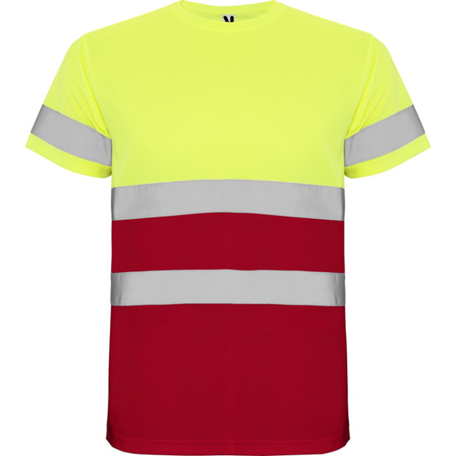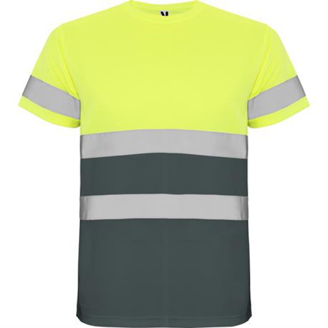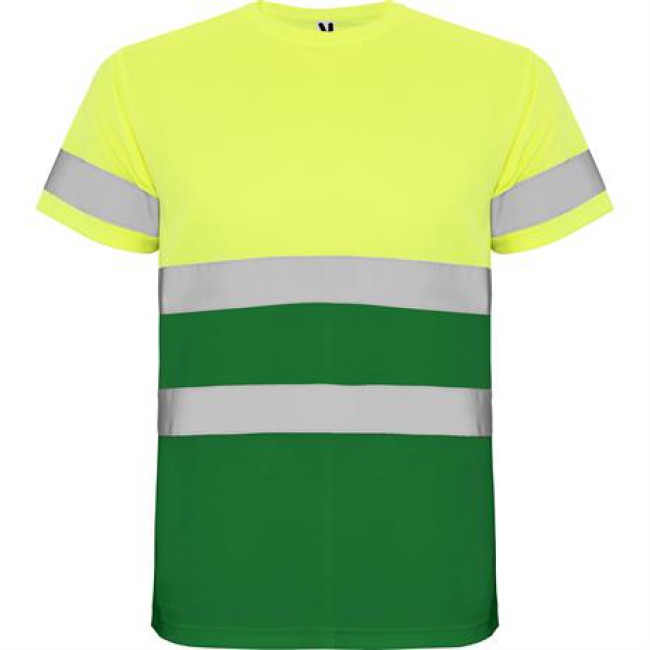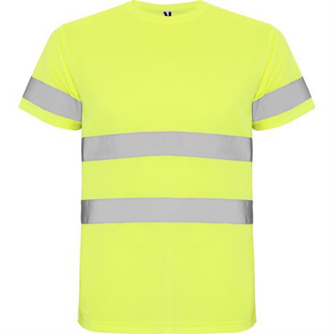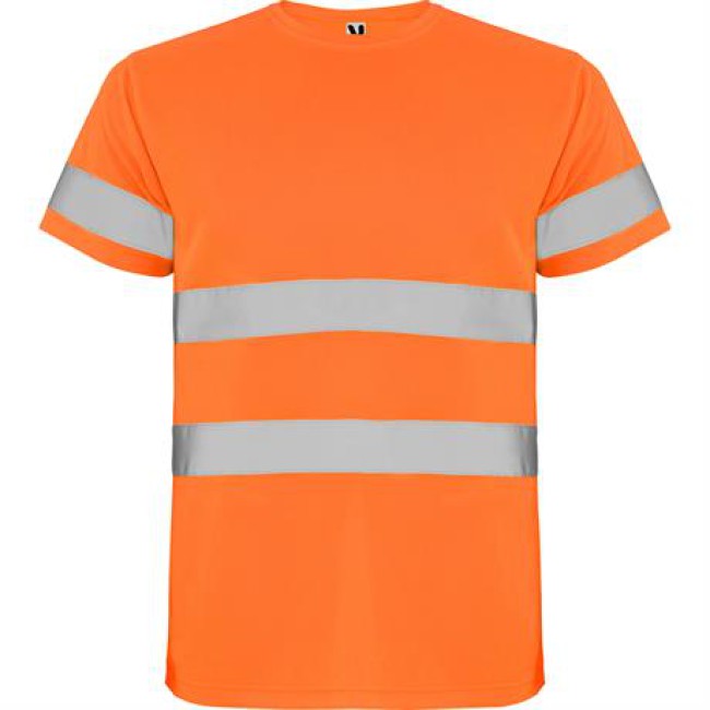 Maglietta tecnica maniche corte ad alta visibilità. · Girocollo nello stesso tessuto, con cuciture rinforzate nella parte interna del collo. · Due strisce riflettenti orizzontali sul torso ed una sulle maniche.