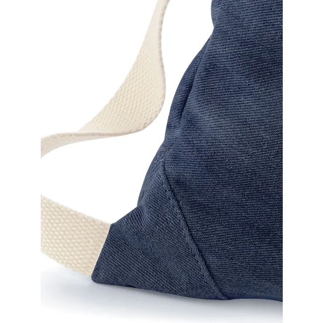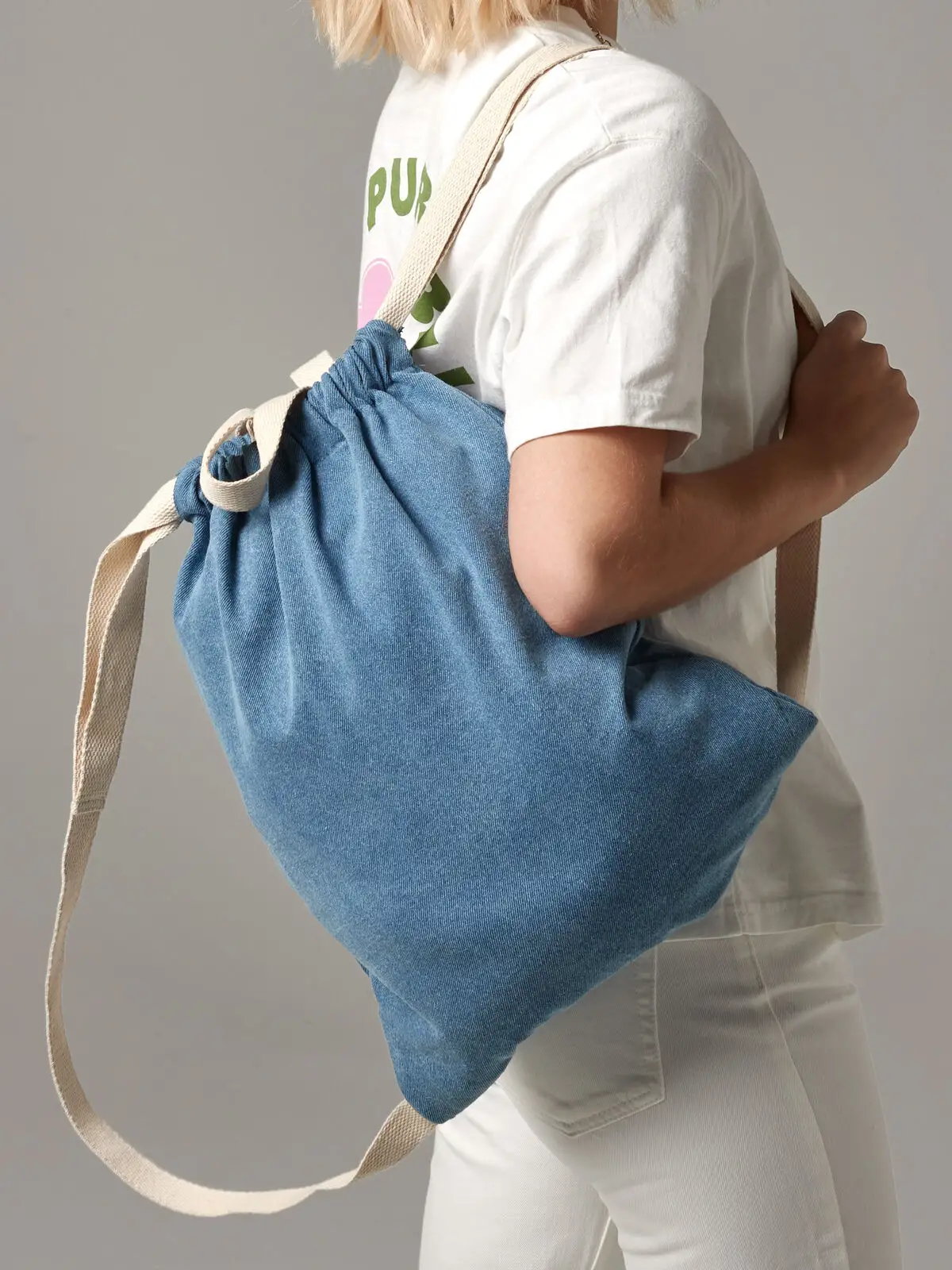 100% miscela cotone e poliestere denim. Sacca con doppio manico, trasportabile a mano o come zaino, chiusura con coulisse, spallacci in cotone. Dimensioni: 46x37 cm, capacità: 12 litri, area stampabile: 16x20 cm.