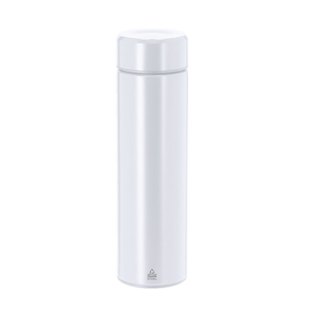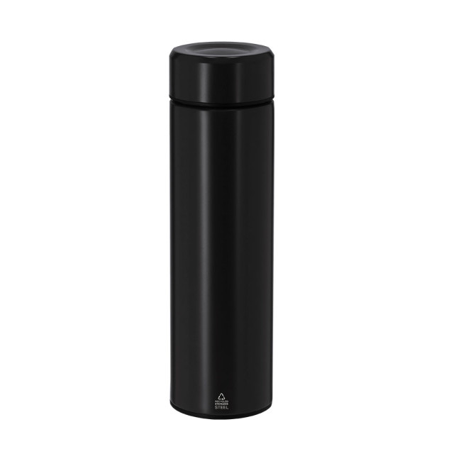 Termo in acciaio inox riciclato da 450 ml di capacità. Con doppia parete per la migliore e più duratura conservazione della temperatura e interno con rivestimento in ceramica, adatto per bevande gassate. Filtrante incluso e sistema di apertura facile a vite. Con etichetta di acciaio inox riciclato.L'acciaio è uno dei materiali più richiesti e che può essere trovato quasi ovunque, da prodotti di uso quotidiano a grandi costruzioni. Con innumerevoli proprietà, tra cui spiccano durabilità e alto grado di riutilizzo, rendendolo un'alternativa molto apprezzata nelle soluzioni di sostenibilità. Adeguatamente trattato, permette di ottenere nuove risorse di utilizzo infinito.