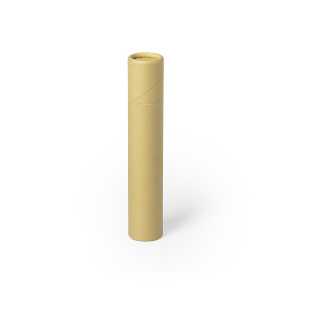 Set di 5 pezzi in una scatola di cartone riciclata. Include 2 matite di legno (non affilate) con corpo cilindrico finitura naturale, penna di cartone, temperamatite in legno e gomma. Coperchio in cartone.