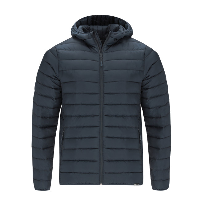 Giubbotto unisex RPET con cappuccio. Realizzato in materiale extra leggero con imbottitura effetto piuma e fodera interna morbida, impermeabile e antivento. Polsini, vita e cappuccio con bordo elastico coordinato. Apertura a zip invertita con tirazip coordinato e protettore per il mento. Include 2 tasche esterne laterali con zip e linguette coordinate, e 2 tasche interne. Etichetta RPET sul bordo e pratica tasca con cordoncino regolabile.