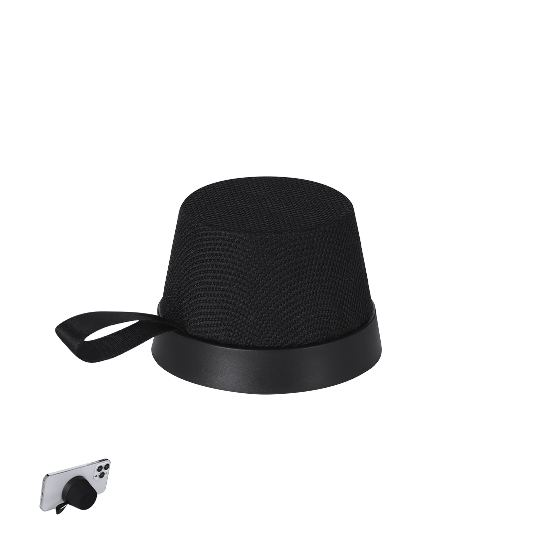 Altoparlante Bluetooth® 3W con gancio magnetico in poliestere RPET. Portamagnetico da mettere sul retro dello smartphone. Include manico in poliestere per un facile trasporto. Connessione Bluetooth 5.3, cavo di ricarica tipo C.