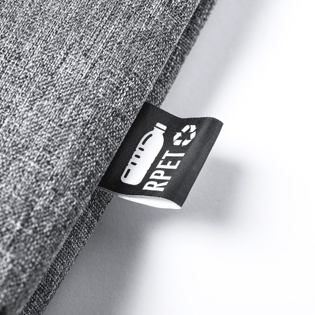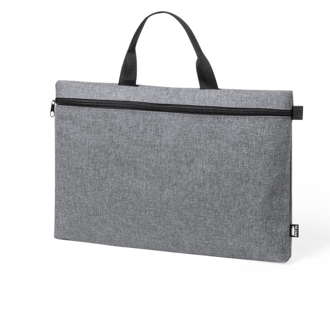 Portadocumenti in RPET 600D con effetto melange, realizzato in plastica riciclata per favorire il riutilizzo dei rifiuti plastici e contribuire alla sostenibilità del pianeta. Dettagli neri e scomparto principale con cerniera. Robuste maniglie abbinate ed etichetta distintiva con logo RPET.