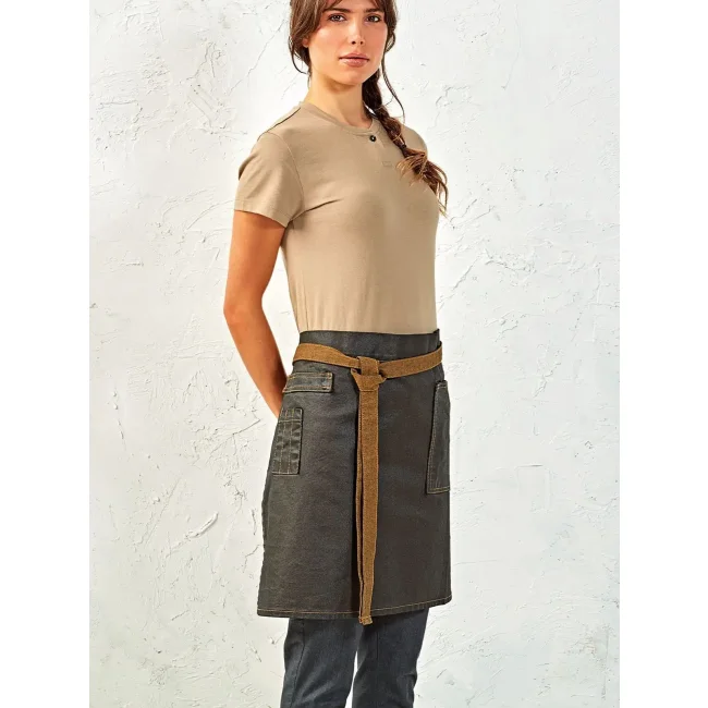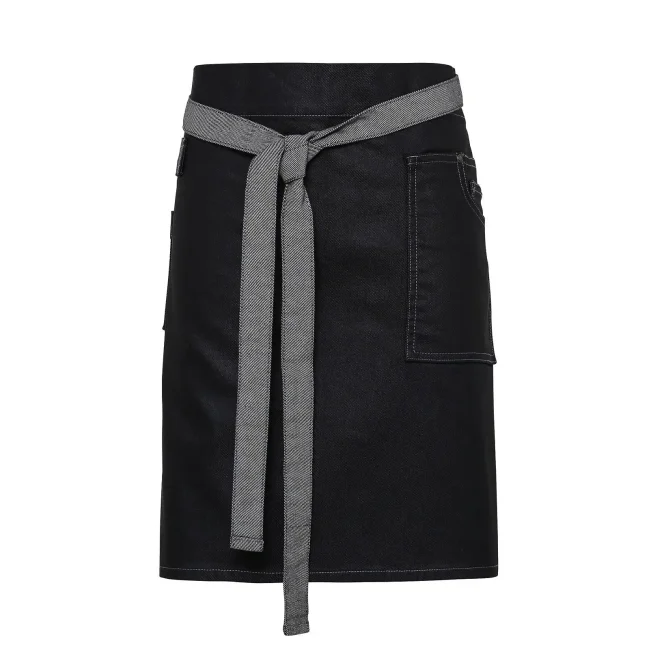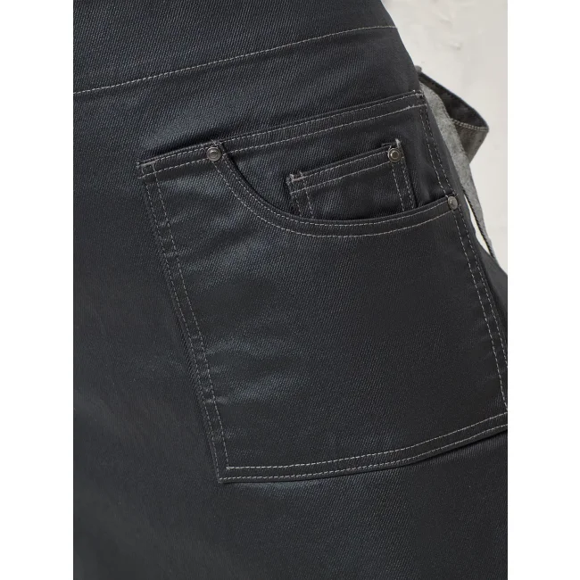 100% Cotone Denim Twill con rivestimento acrilico. Grembiule con finitura in acrilico che crea una protezione impermeabile, cuciture e tessuto di jeans a contrasto, una tasca di grandi dimensioni applicata e una di servizio. Lavabile a 60°C. Cordoni in vita lunghi 1 metro ciascuno.