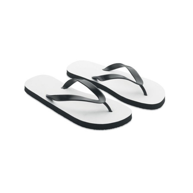Queste comode infradito da spiaggia adatte per la sublimazione hanno il cinturino in PVC. La suola è in gomma con rivestimento superiore in poliestere. Calzature perfette durante le calde giornate estive o quando sono previste attività acquatiche. La taglia 44-46. L'articolo può essere ordinato solo stampato.