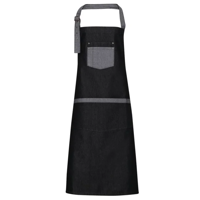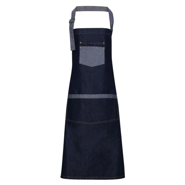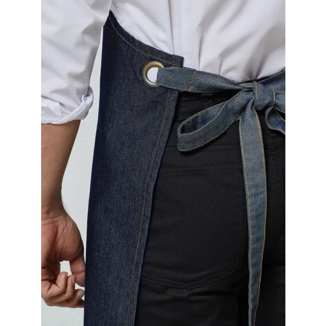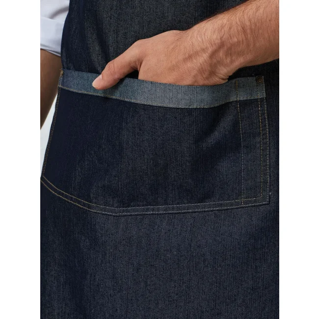 70% cotone, 30% poliestere. Grembiule in denim con pettorina e due occhielli metallici grandi ferma-cintura. Tasca centrale con taschino porta-penna combinato. Bordino in contrasto con effetto bicolore sulla tasca e sul laccio in vita, allaccio posteriore con lacci da 100 cm. Lavabile a 60°C.
