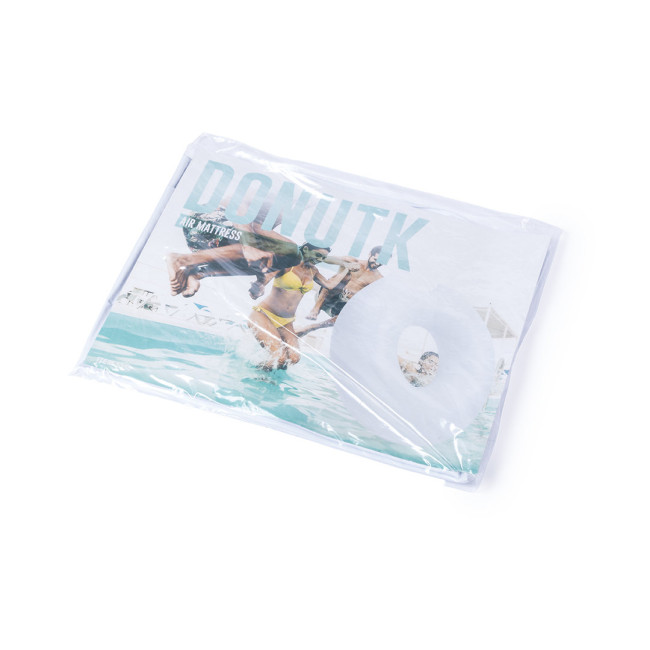 Originale materasso gonfiabile in PVC in formato maxi e a forma di ciambella con morso. Presentato con una speciale piegatura per facilitarne la stampa.