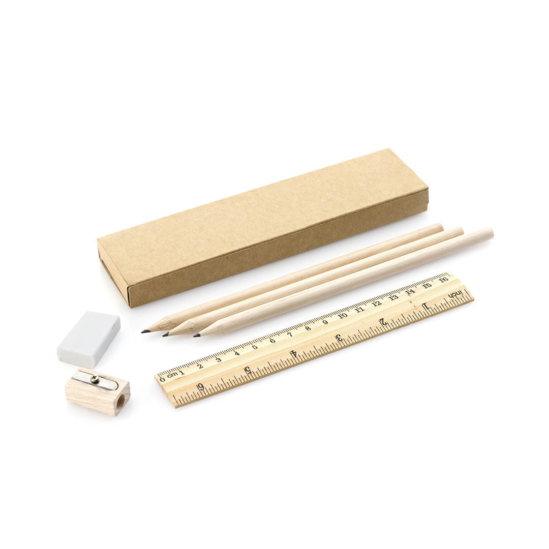 Set di 6 pezzi con 3 matite in legno con corpo rotondo con finitura naturale e mina nera, righello da 20 cm con sistema metrico in centimetri/pollici, gomma e temperamatite. Presentato in una scatola di cartone riciclato.
