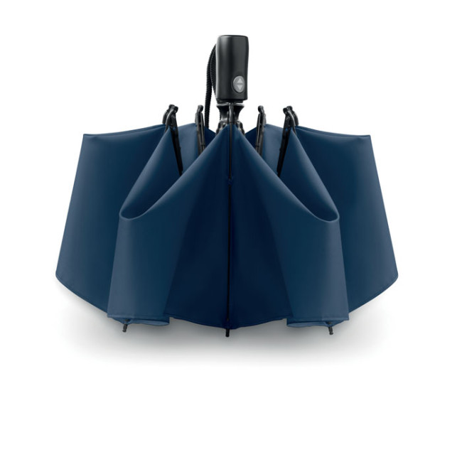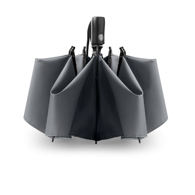 Ombrello reversibile 23'' in pongee e asta in metallo cromato. Struttura in fibra di vetro. Manico in ABS con pulsante. In pouch abbinata.