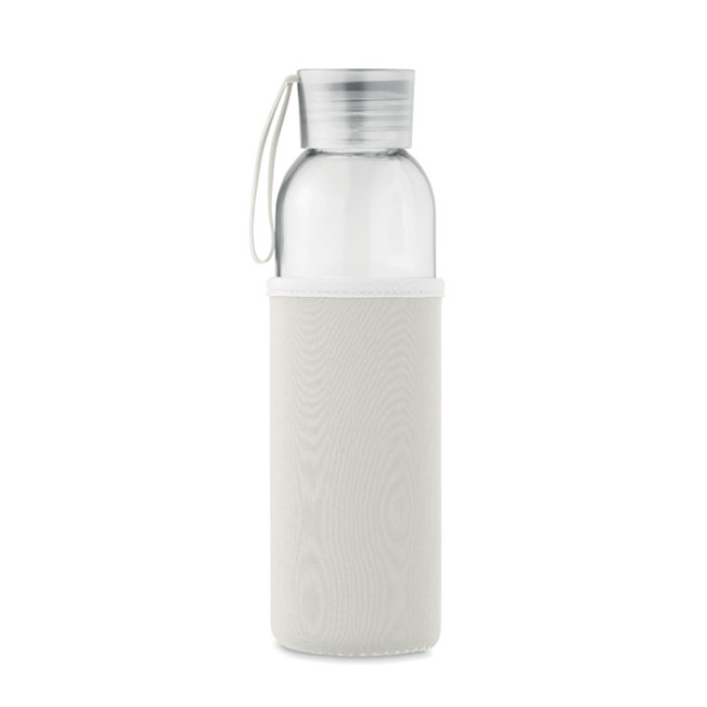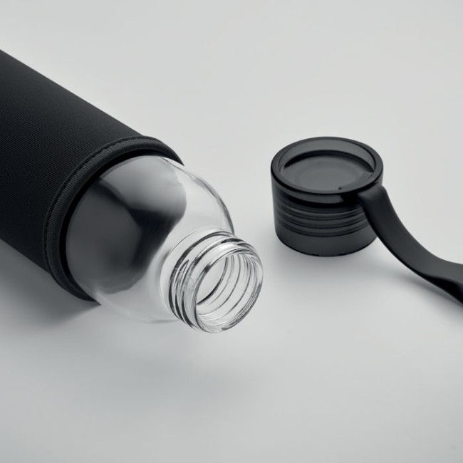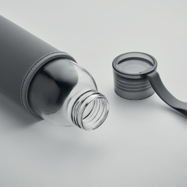 Bottiglia in vetro riciclato con custodia in neoprene e coperchio in PP con gancio in silicone. Antigoccia. Capacità: 500 ml.