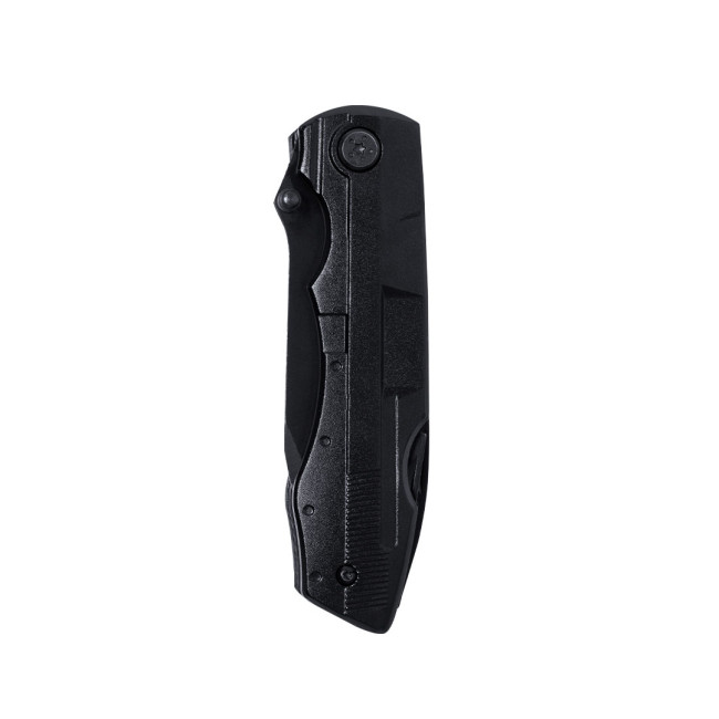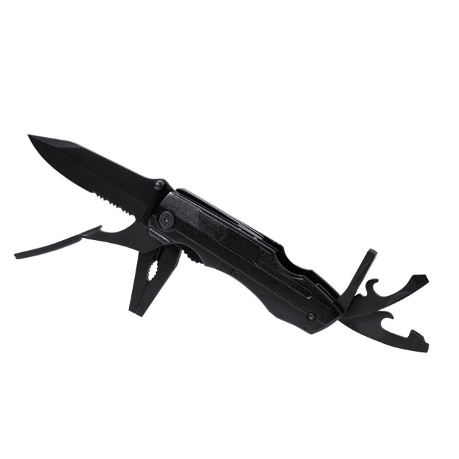 Coltello multiuso con finitura nera in acciaio inox e resistente impugnatura coordinata in alluminio. Design pieghevole e dimensioni compatte. Include 10 funzioni: - Cacciavite con punte multiple- Coltello a lama liscia e seghettata-Apribottiglie-Apriscatole-Pinze con tagliafiliPresentato in un pratico astuccio in poliestere coordinato con accessorio per cintura.
