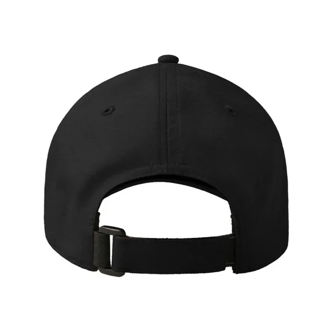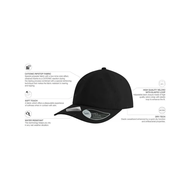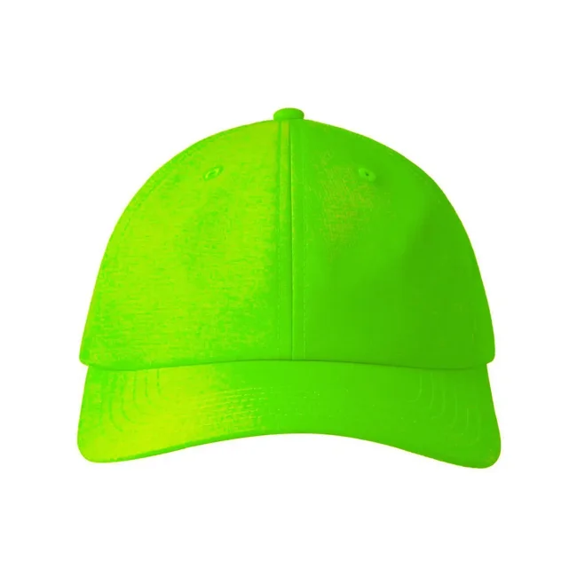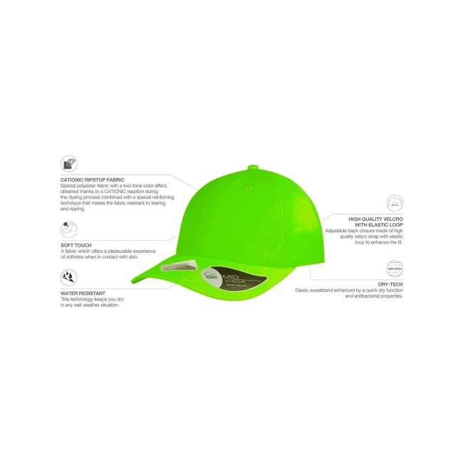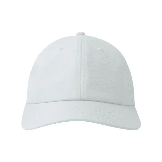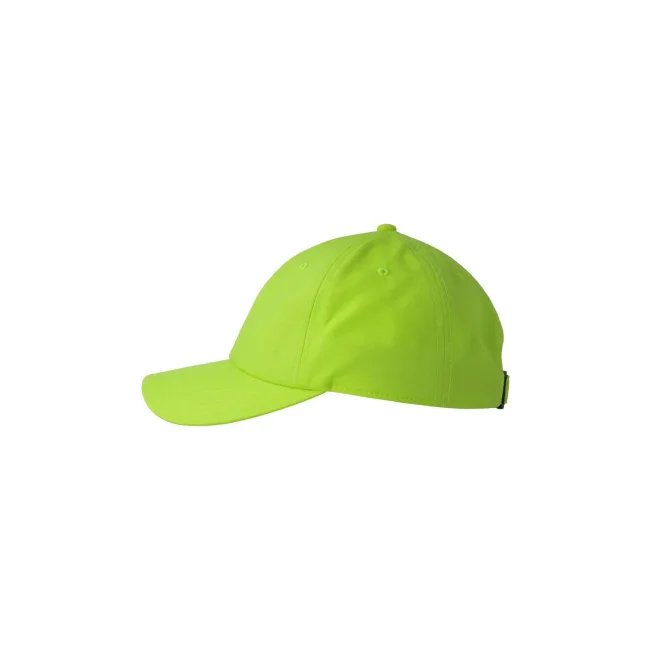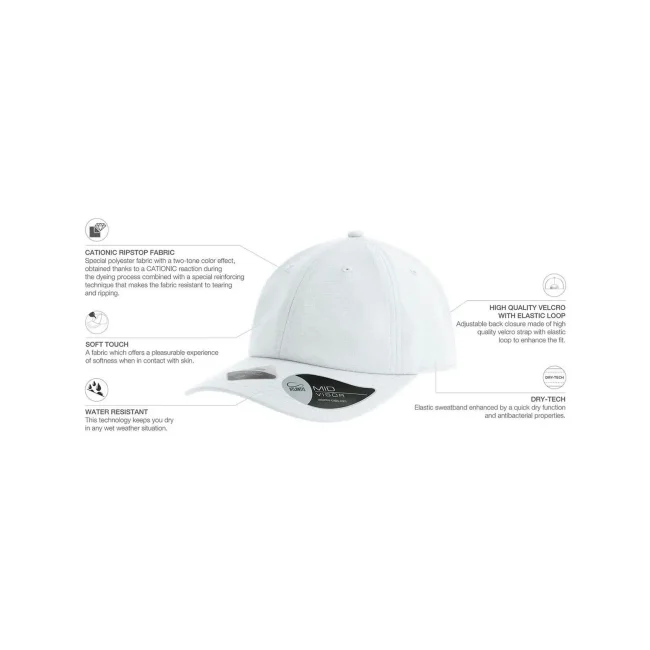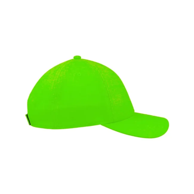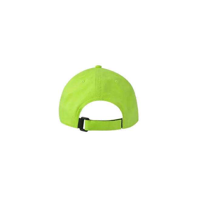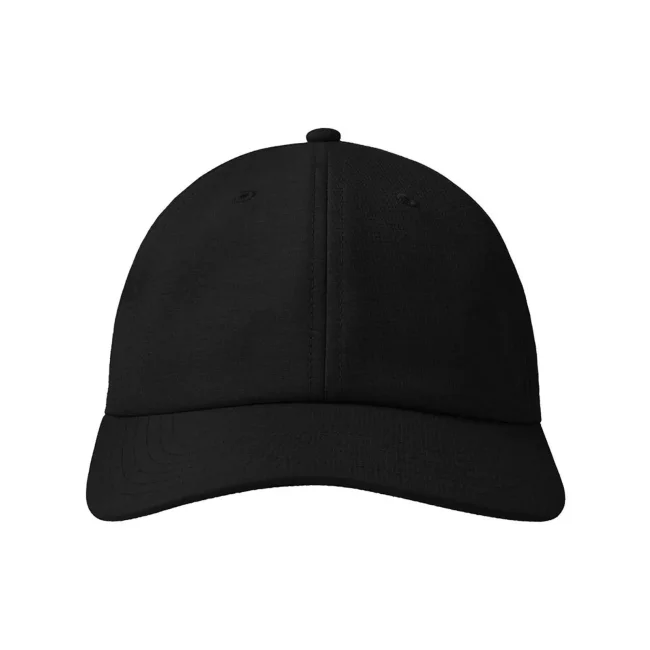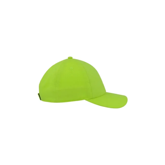 100% poliestere. Cappellino baseball non strutturato a 6 pannelli, visiera precurvata, occhielli ricamati, chiusura in velcro di alta qualità, 6 cuciture sulla visiera. Tessuto idrorepellente molto leggero con fascia antisudore dry-tech, etichetta removibile.