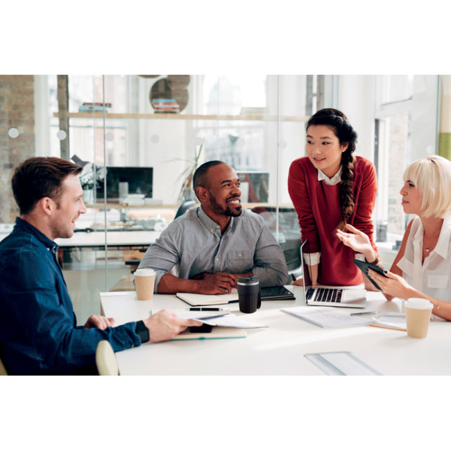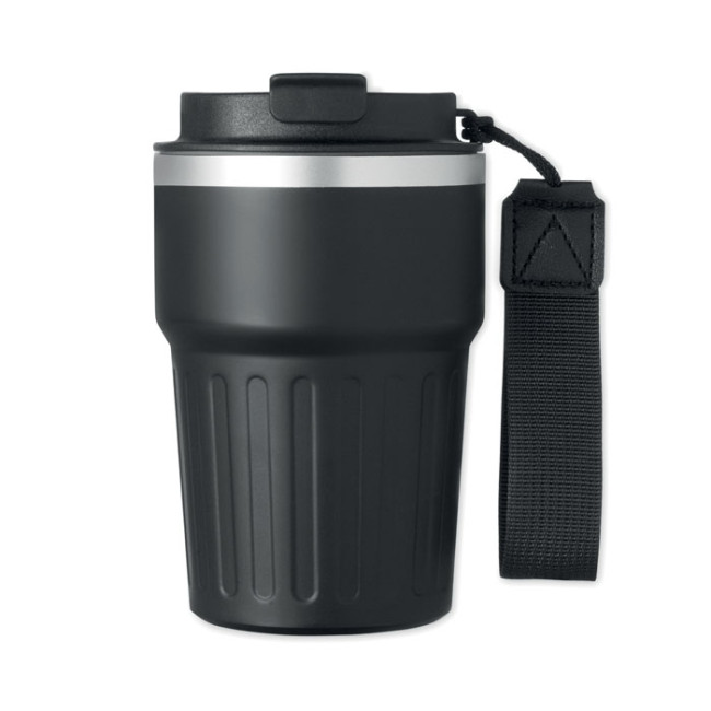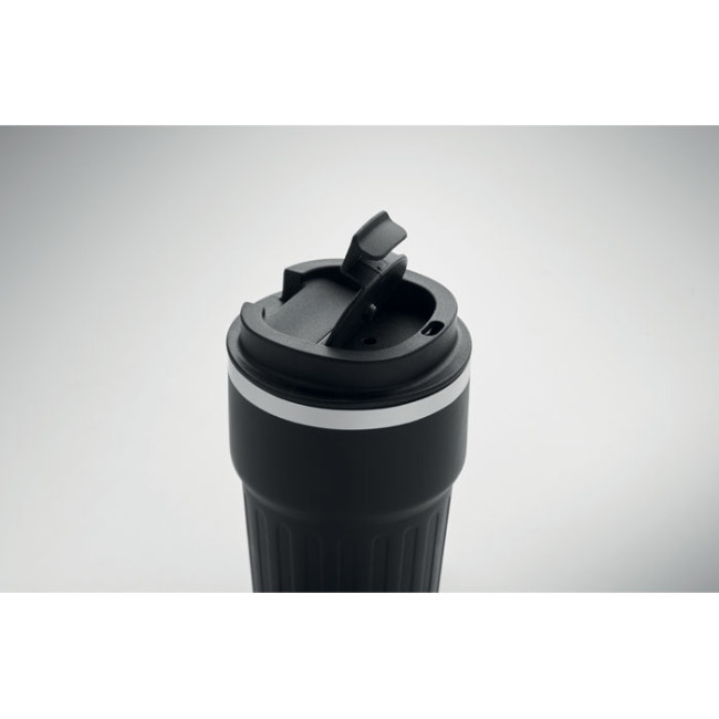 Notebook A5, penna a sfera in alluminio riciclato e bicchiere da 350 ml a doppio strato in acciaio inossidabile riciclato con coperchio e tracolla in PP, in confezione regalo. Certificato FSC.