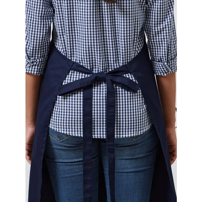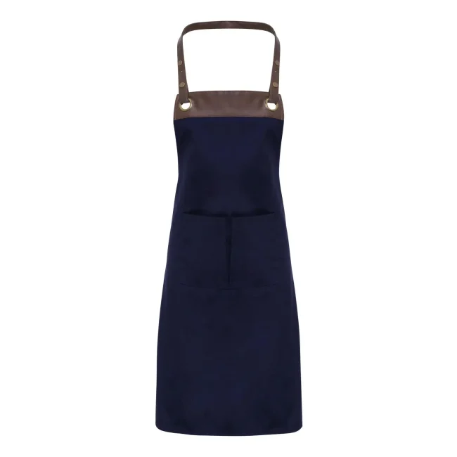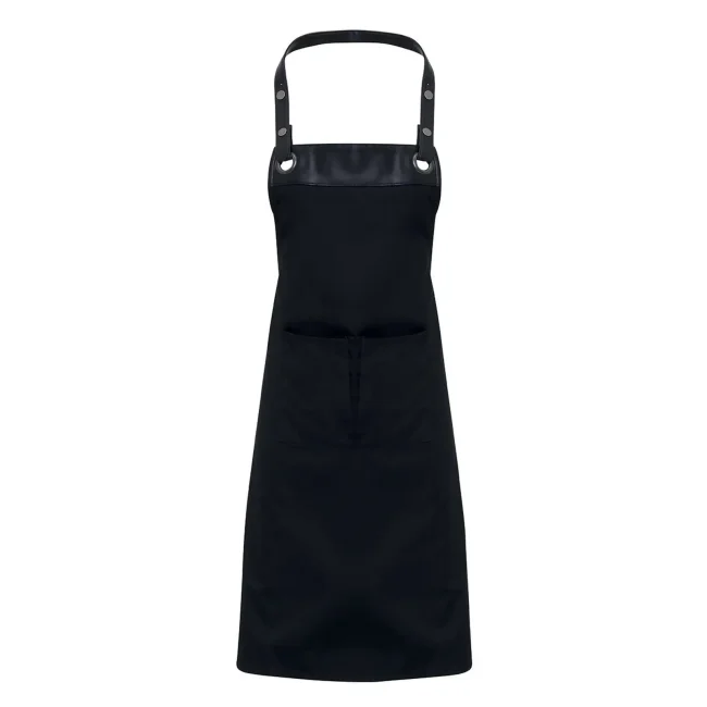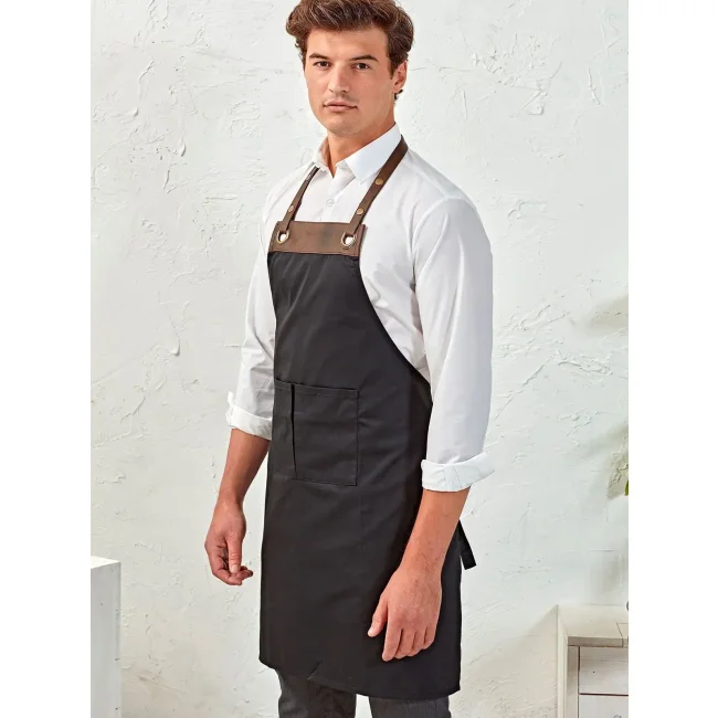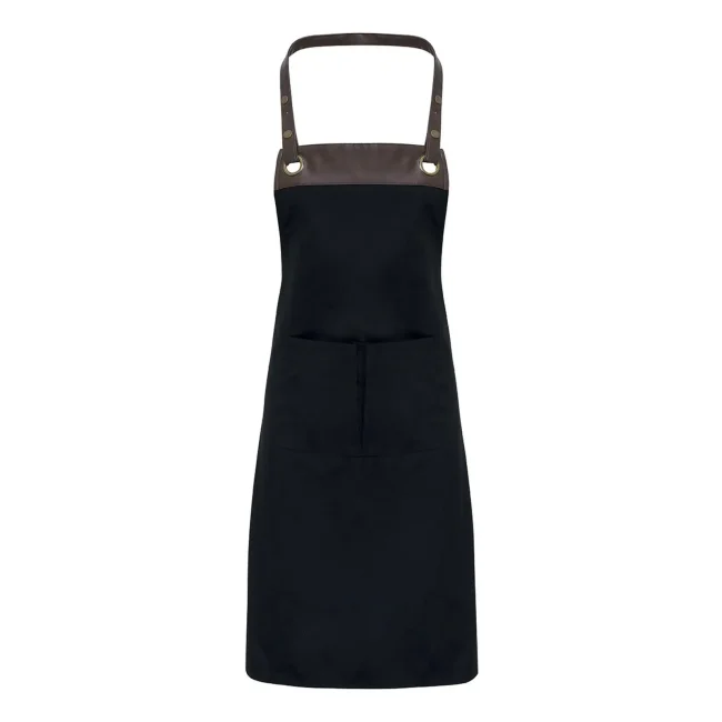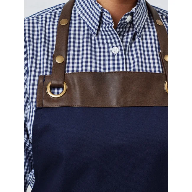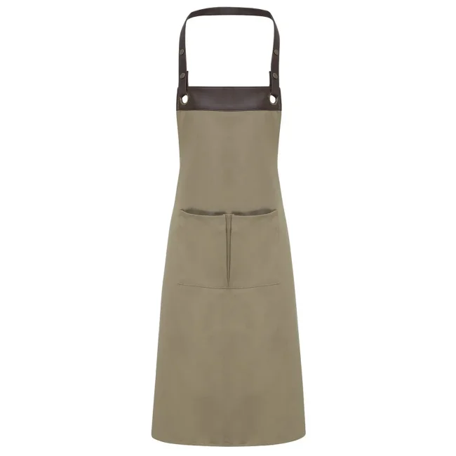 65% poliestere, 35% cotone con rifiniture in finta pelle. Grembiule taglia unica con girocollo in finta pelle, bottoni a pressione sul collo, occhielli in metallo, due pratiche tasche di 13 cm.
