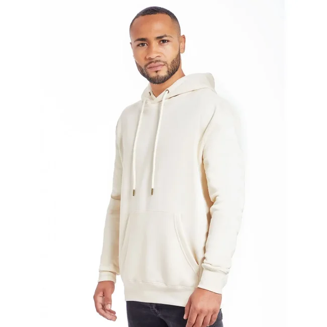 80% cotone organico 20% poliestere riciclato rPET. Felpa unisex con cappuccio a doppio strato e maniche set-in. Cordino tondo tono su tono con punte in metallo, occhielli in metallo. Nastro di rinforzo al collo tono su tono, polsini e orlo in costina, tasca a marsupio. Etichetta removibile al collo. Etichetta con istruzioni di lavaggio in cotone organico.