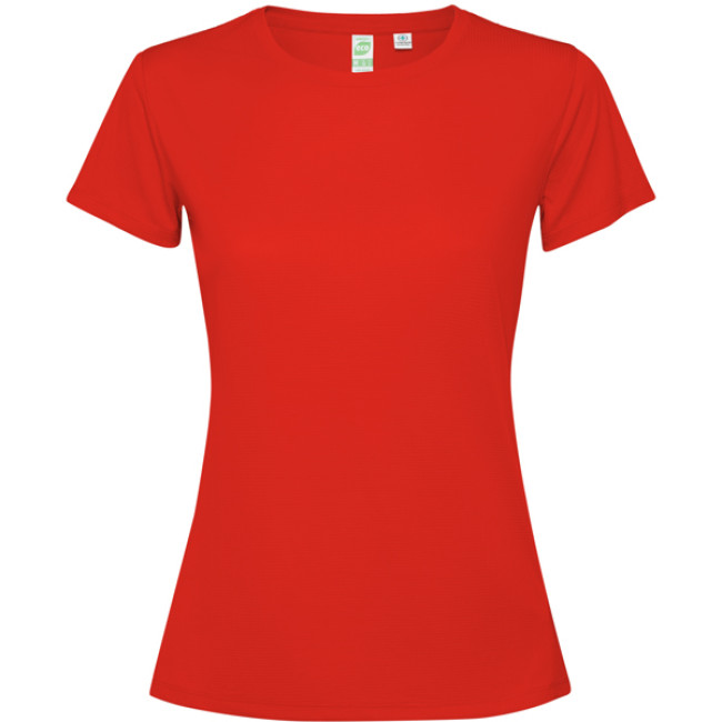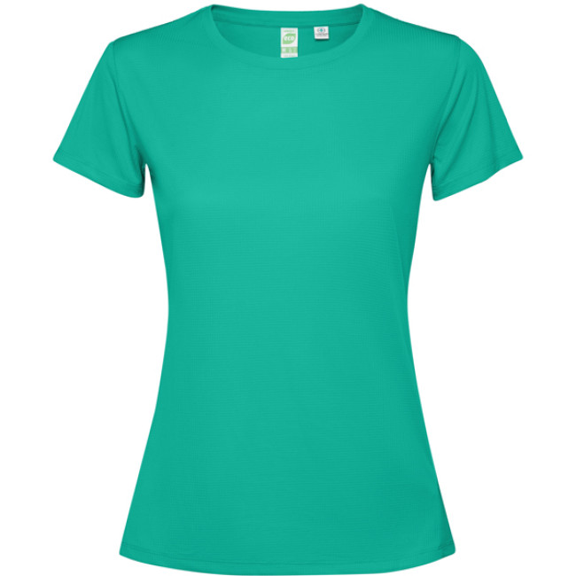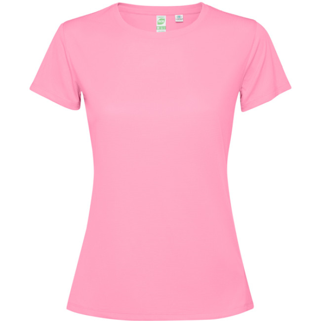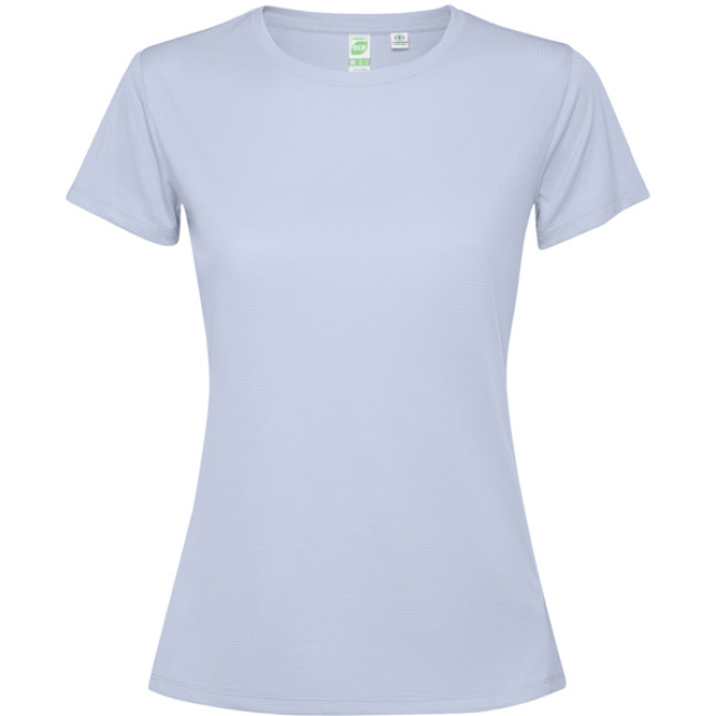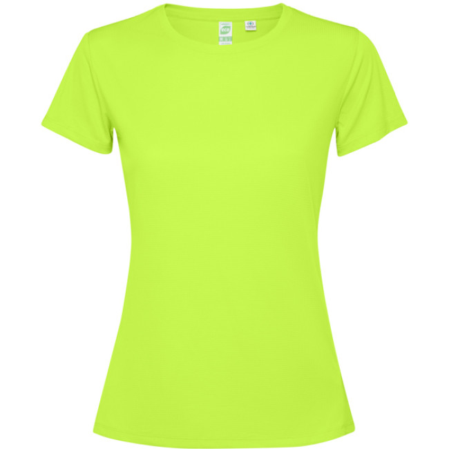 Maglietta tecnica da donna aderente a maniche corte. Colletto con cuciture coordinate. Orlo posteriore leggermente più lungo rispetto a quello anteriore. Cuciture laterali spostate in avanti.