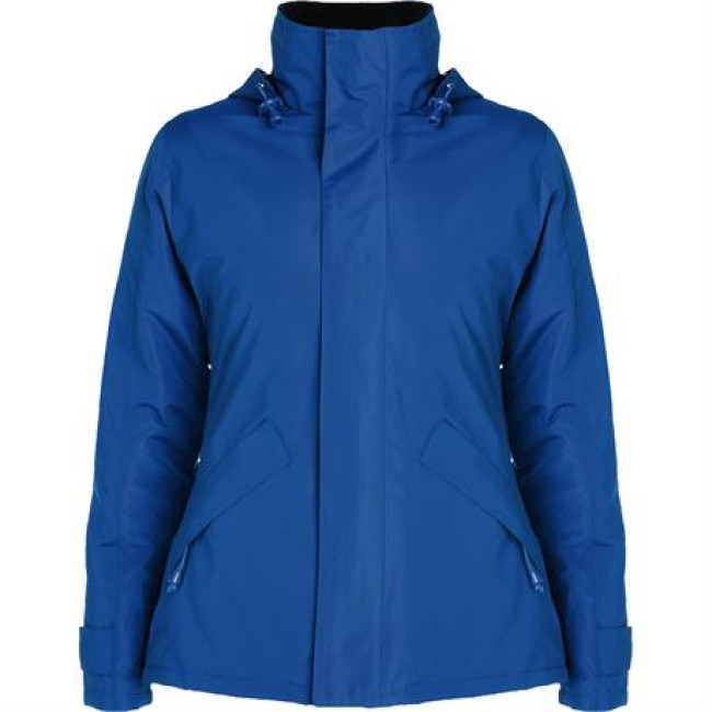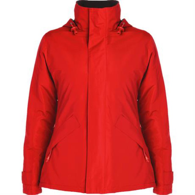 Parka aderente, impermeabile e imbottito. · Cerniera centrale iniettata con patta. · Collo alto con cappuccio ripiegato rimovibile. · Tasche laterali con cerniera e patta. · Polsini regolabili in velcro. · Due tasche interne sul petto con chiusura a velcro.· Accesso interno per la serigrafia o il ricamo.