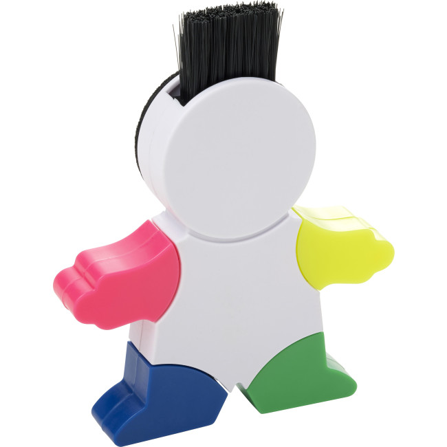 Evidenziatore in ABS a forma di omino, con quattro colori (giallo, fucsia, verde e blu), funzione pulisci schermo sul retro, spazzola per tastiera estensibile