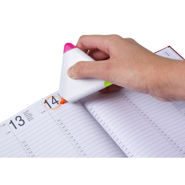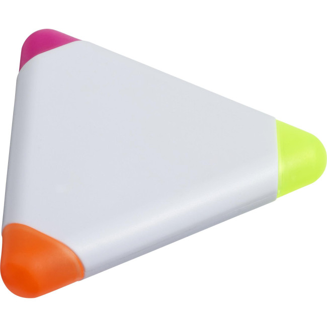Evidenziatore in ABS a forma di triangolo, ciascuna punta ha un colore diverso: fucsia, arancione e giallo