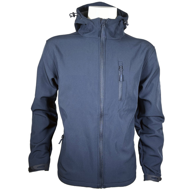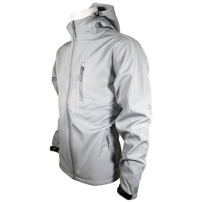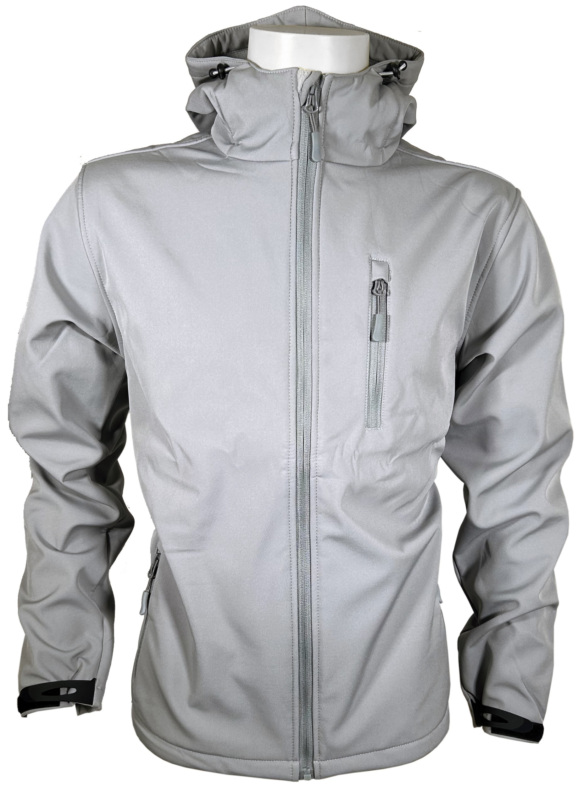 Giacca softshell con cappuccio, cerniera lunga, tasche laterali con cerniera. Taschino lato cuore con cerniera