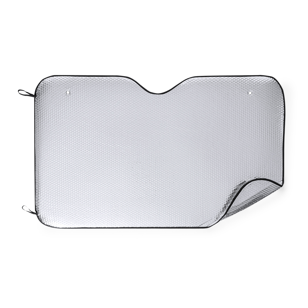 Parasole da auto in alluminio con bolla su entrambi i lati in colore argento con finitura metallizzata e finiture nere. Dimensioni 130x80cm, con anelli di rinforzo in metallo, elastici per la piegatura, due ventose per il corretto posizionamento nel lunotto e inviato steso per una facile stampa.