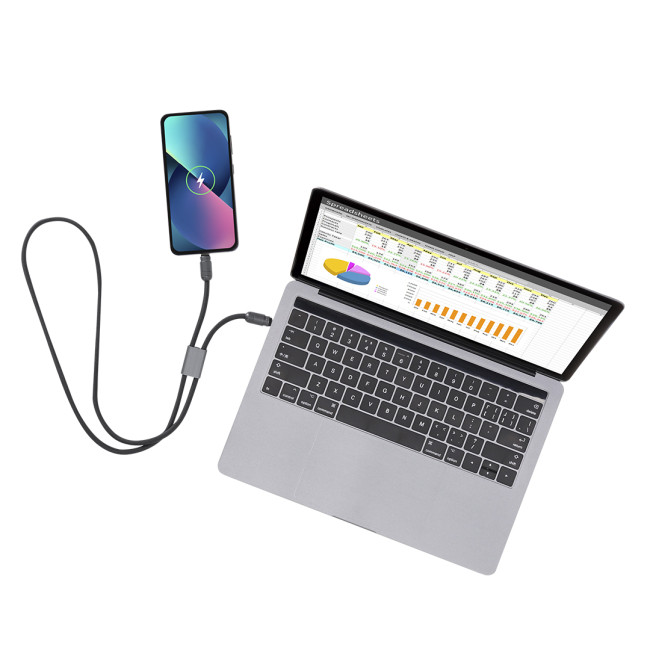 Bracciale cavo di ricarica, funzione di trasferimento dati e supporto per smartphone. Con ingresso/uscita Tipo C e potenza di 60W, che consente la ricarica rapida. Funzionalità e comodità in un unico accessorio.