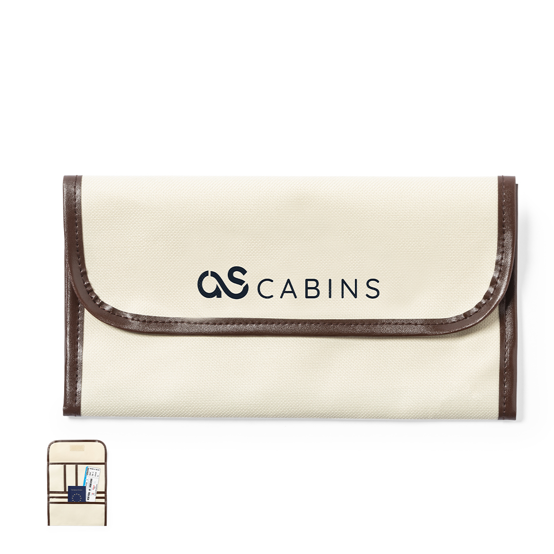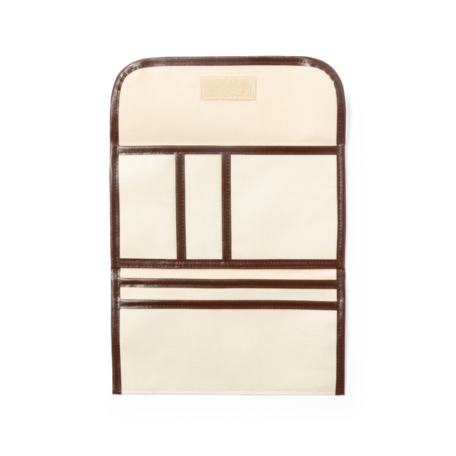 Portadocumenti da viaggio in resistente 600D naturale con finiture e rinforzi in similpelle marrone. Patta con chiusura a velcro e numerosi scomparti interni.