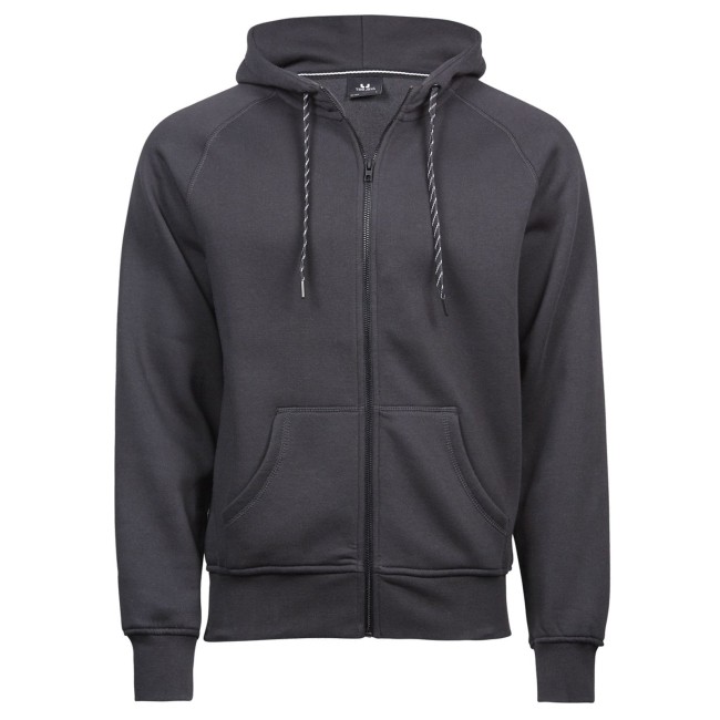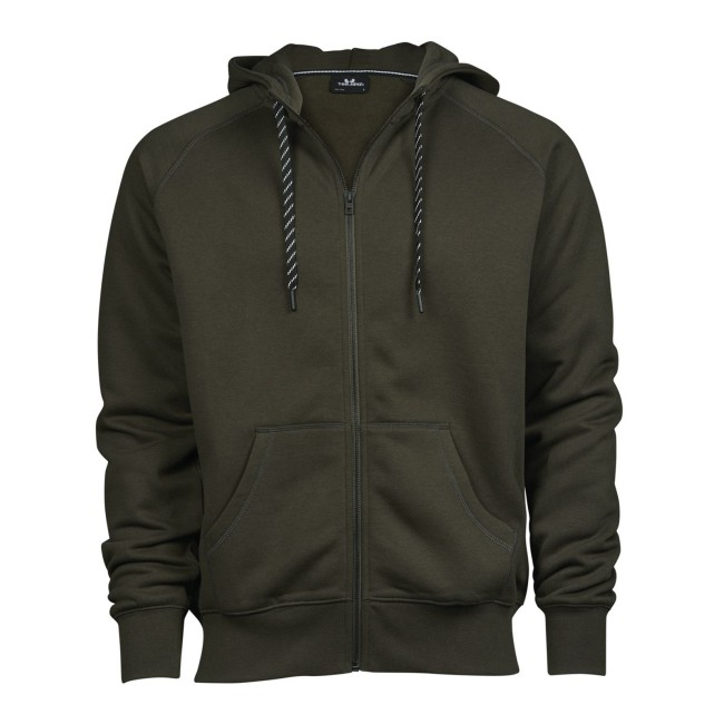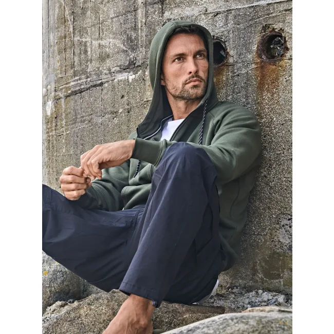 70% cotone ringspun, 30% poliestere. Felpa con maniche raglan, zip intera, cappuccio con cordoncino in contrasto, costina con lycra, doppie cuciture, tessuto in fibra di cotone egiziano, felpata internamente, tessuto a 3 fili, ideale per stampa e ricamo, struttura con cuciture laterali.
