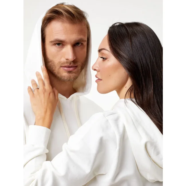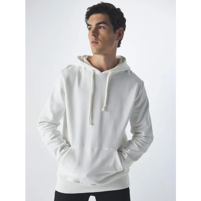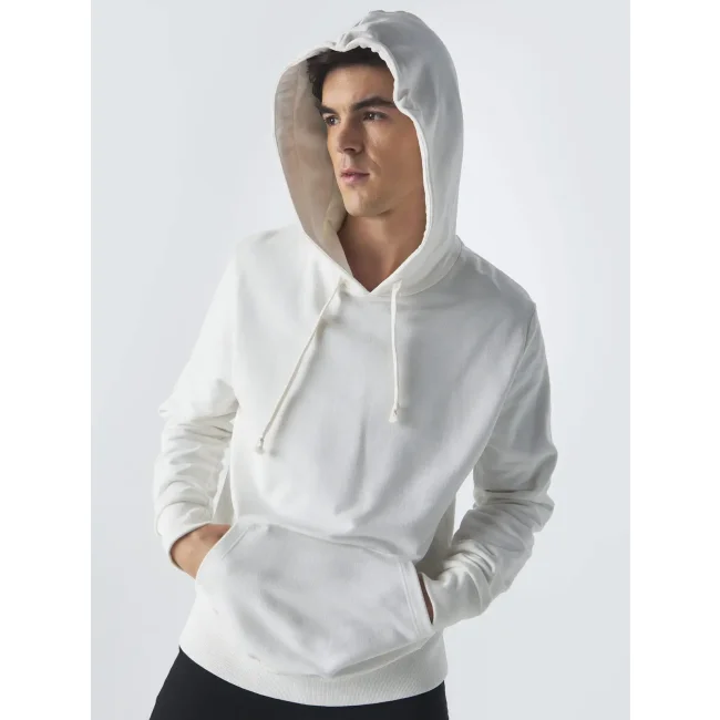100% cotone pettinato. Felpa con cappuccio doppio, french terry, manica dritta, fit moderno, struttura con cuciture laterali, tasca a canguro, collo senza etichetta, ma con un piccolo adesivo taglia, etichetta composizione, taglia e made in Italy sul fianco. Non felpata internamente. Colore NTR adatto per tinto in capo con cuciture 100% cotone. Prodotta in Italia.