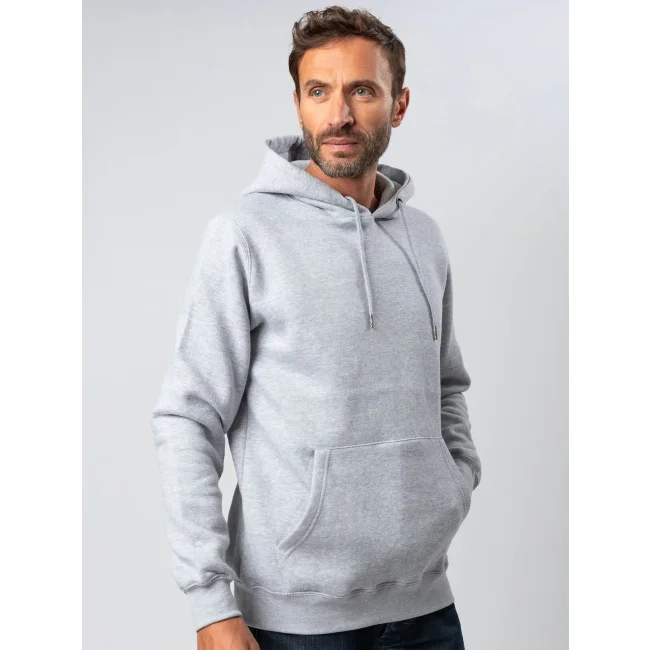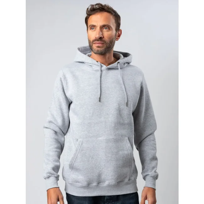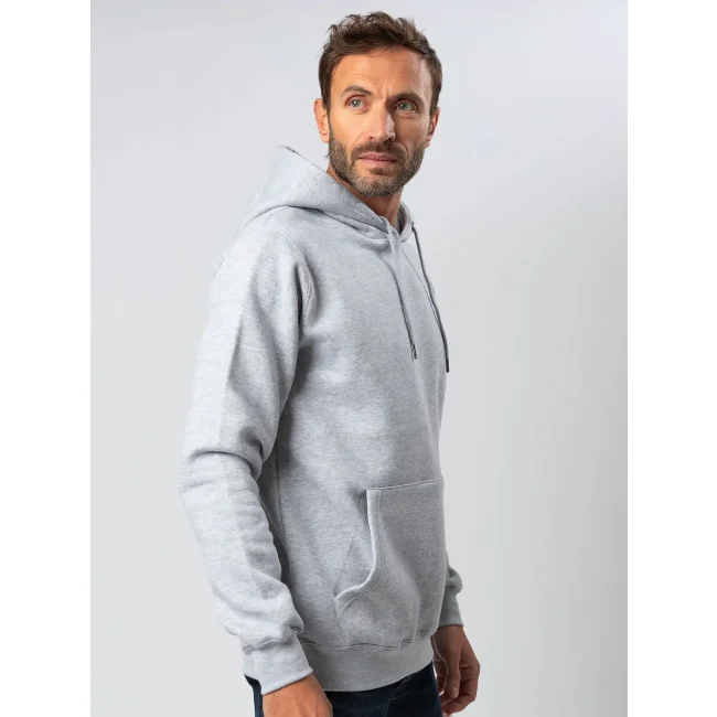 70% cotone, 30% poliestere. Felpa con maniche set-in, unisex, felpata internamente, cappuccio a doppio strato, occhielli in metallo, cordini con punta in metallo, grande tasca a marsupio, struttura con cuciture laterali, fascia in vita e polsini in costina. Etichetta strappabile. Interno in poliestere ed esterno 100% cotone.