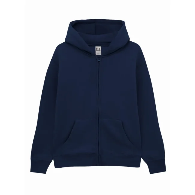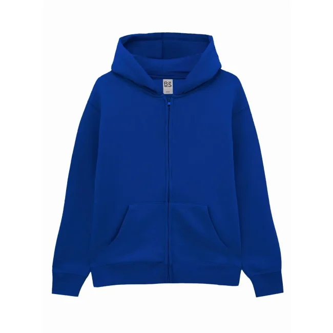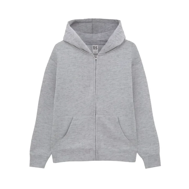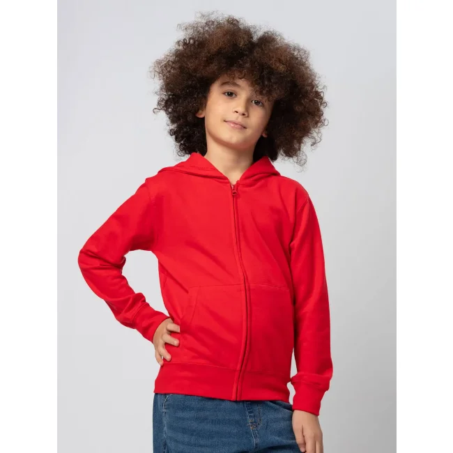 80% cotone, 20% poliestere. Felpa french terry da bambino con cappuccio e zip, maniche set-in, tasca a marsupio. Orlo inferiore e polsini in costina elasticizzata, struttura con cuciture laterali. Etichetta strappabile. Parte esterna: 100% cotone, parte interna: 50% cotone, 50% poliestere. Il trattamento peach finish rende il tessuto ancora più morbido al tatto.