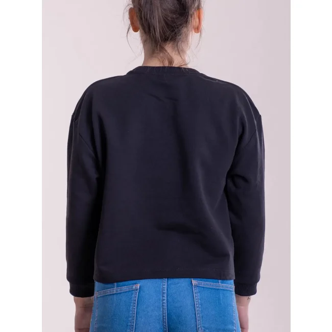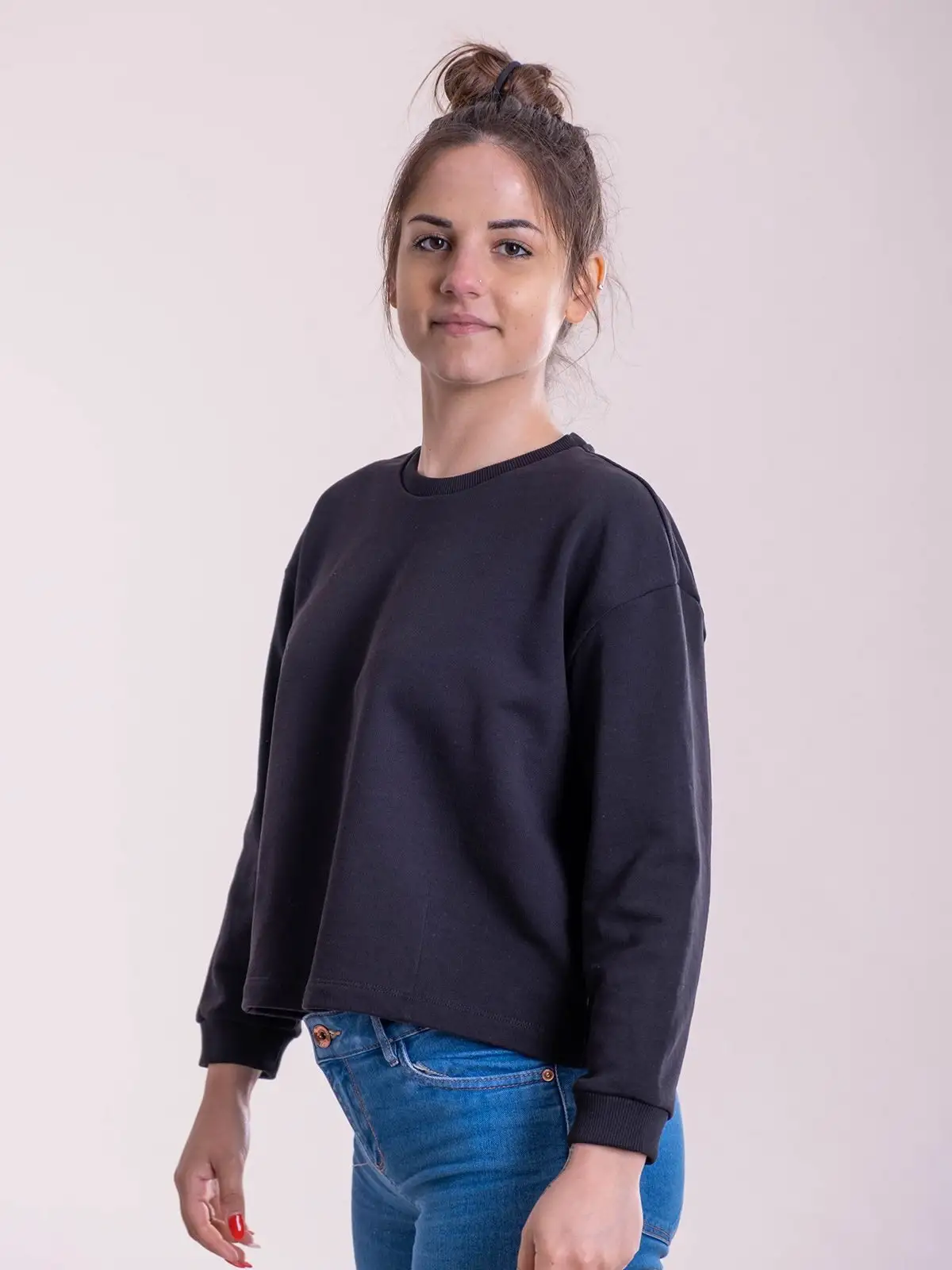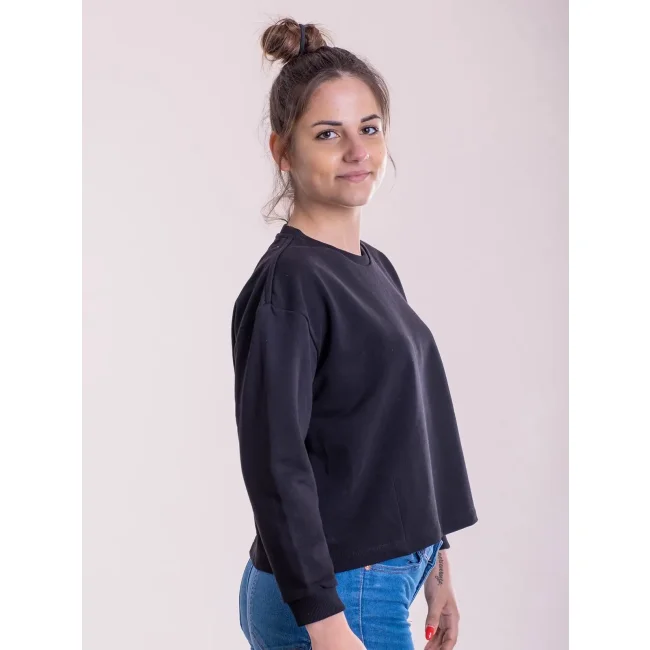 100% cotone. Felpa girocollo crop donna, manica setin a 3/4. Orlo in fondo dritto, senza fascia in costina. Senza etichetta, solo un'etichetta taglia al collo.
