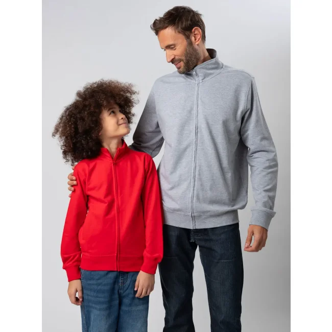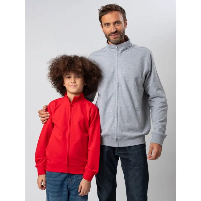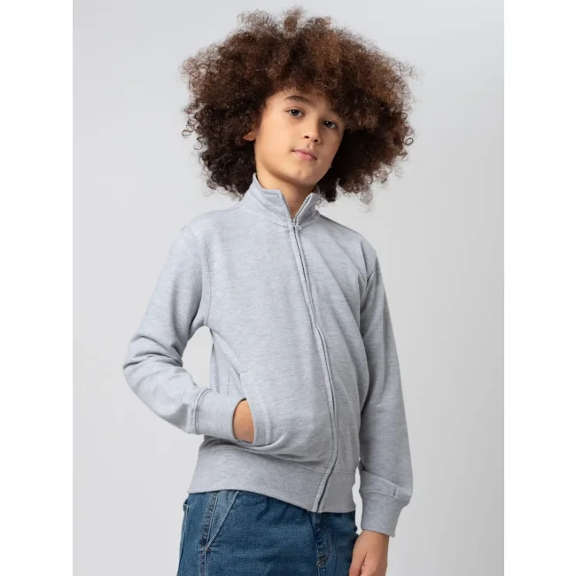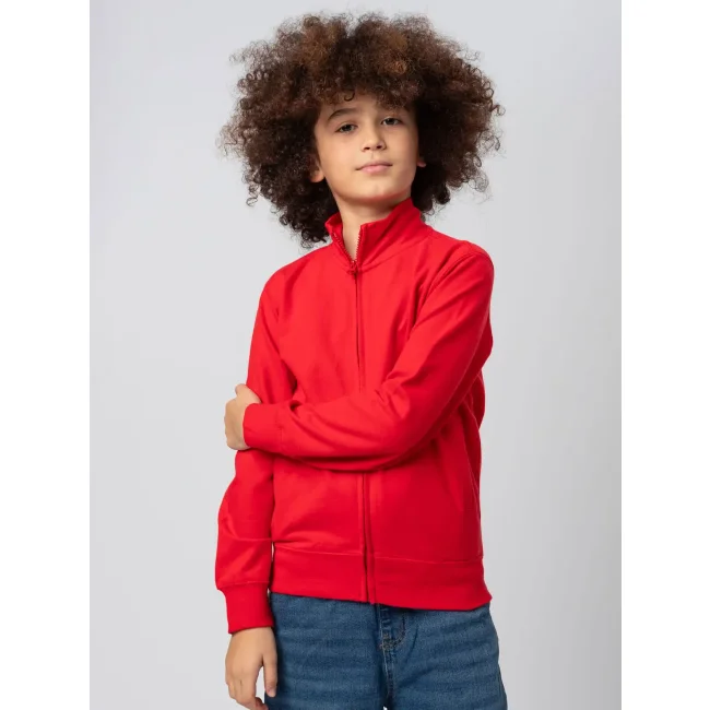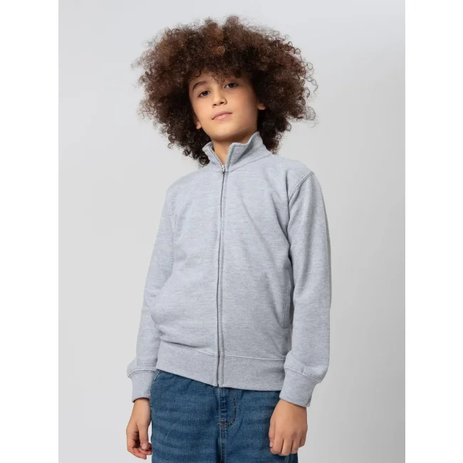 80% cotone, 20% poliestere. Felpa french terry da bambino con zip intera, maniche set-in, collo alto, tasche a filetto. Orlo inferiore e polsini in costina elasticizzata, struttura con cuciture laterali. Etichetta strappabile. Parte esterna: 100% cotone, parte interna: 50% cotone, 50% poliestere. Il trattamento peach finish rende il tessuto ancora più morbido al tatto.