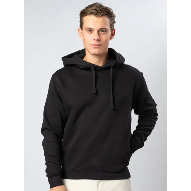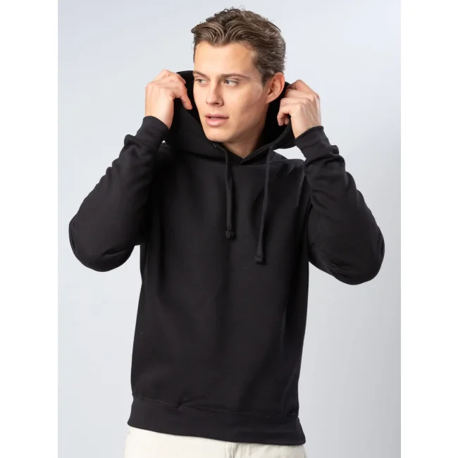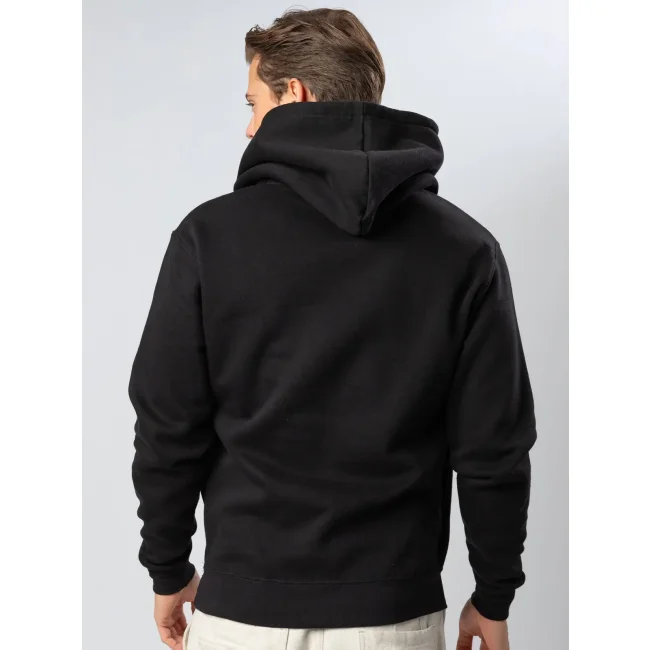 70% cotone, 30% poliestere. Felpa con cappuccio doppio e tasche a filetto inserite nelle cuciture laterali per una maggiore superficie di stampa. Piccola etichetta taglia al collo, etichetta composizione sul fianco. Felpata internamente. Interno in poliestere ed esterno 100% cotone.