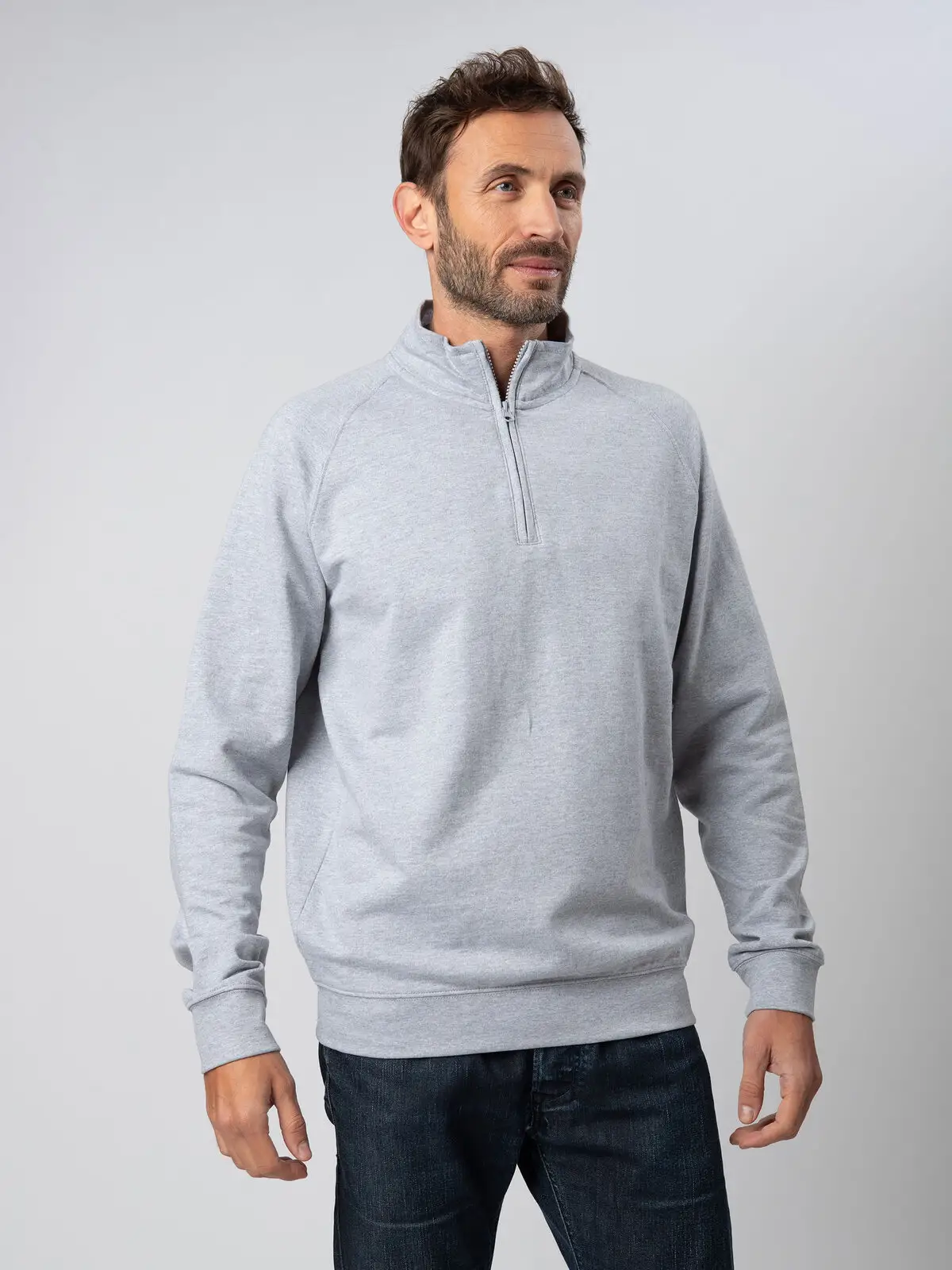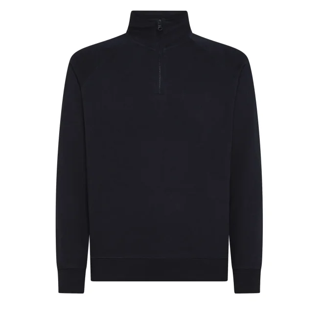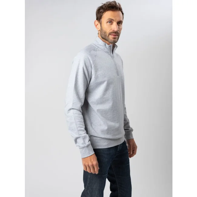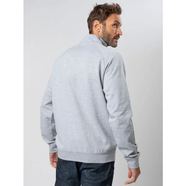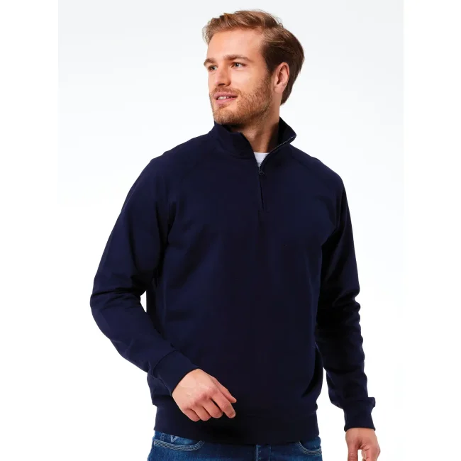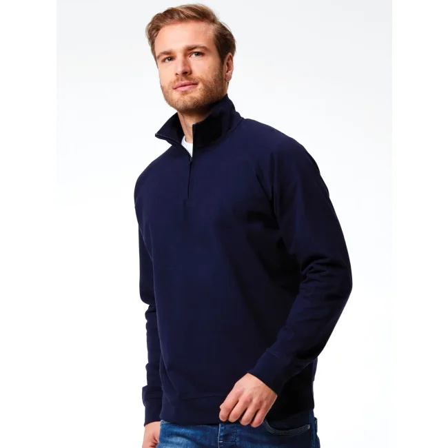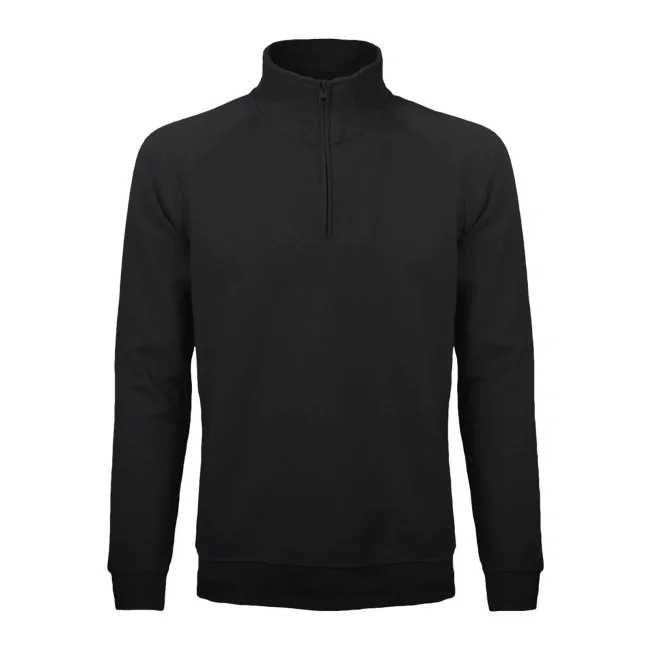 Felpa mezza zip in french terry composta da 80% cotone e 20% poliestere. Presenta maniche raglan e collo alto, con polsini in costina e struttura con cuciture laterali. L'etichetta strappabile offre praticità e comfort. La parte esterna è in cotone, mentre l'interno è in poliestere per garantire calore e morbidezza.