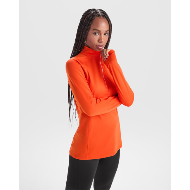 Felpa tecnica a maniche lunghe raglan da donna, con colletto a mezza zip dal design inverso e fascia catarinfrangente. I polsini con aperture per il pollice e il caldo tessuto interno spazzolato garantiscono comfort e praticità. Personalizzabile con logo per un tocco personale.